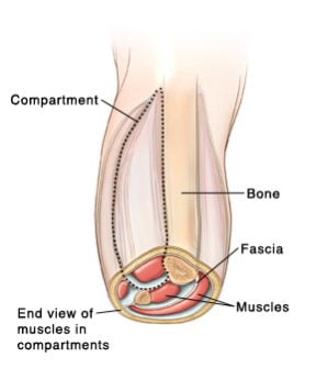 Le terme médical est le Syndrome du Compartiment d’Efforts Chronique (CECS) ou, dans les cas plus graves, le Syndrome du Compartiment Aigu (SCA). C’est la conséquence de l’élévation de la pression intra-tissulaire dans une ou plusieurs loges, c’est-à-dire dans les compartiments musculaires fermés par une membrane fibreuse inextensible appelée aponévrose qui sont présent dans la jambe, l’avant-bras ou la main. Cette pathologie douloureuse peut s’accompagner d’une diminution de la circulation sanguine qui augmente la souffrance des fibres musculaires et des nerfs.