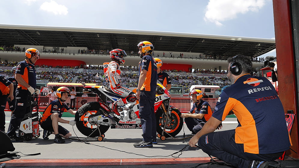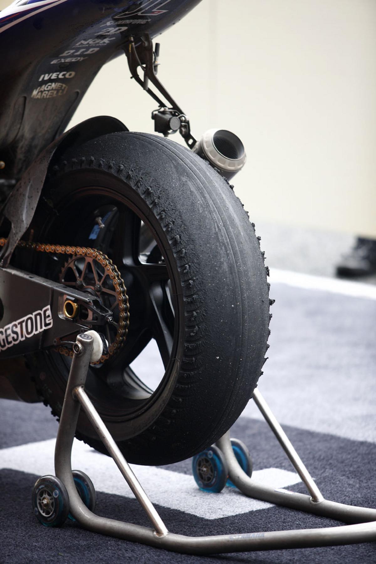 Les pneus slicks se réchauffent donc plus lentement et ont besoin de couvertures chauffantes pour les maintenir à la température de fonctionnement avant de partir sur la piste.