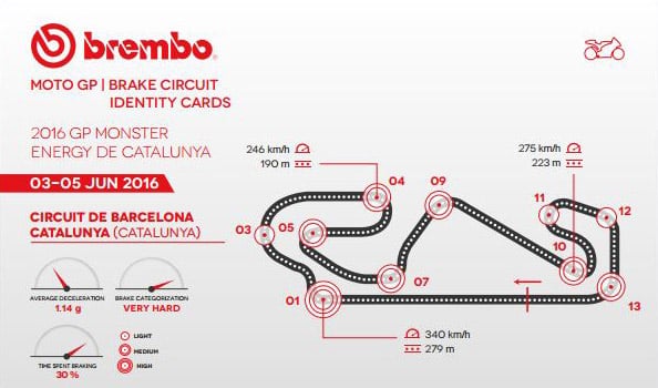 Outre son grip très modéré, le circuit de Barcelona-Catalunya est caractérisé par le fait qu’il est considéré comme une piste très technique (voir les propos de Guy Coulon) avec des freinages très brutaux qui mettent les freins à rude épreuve.