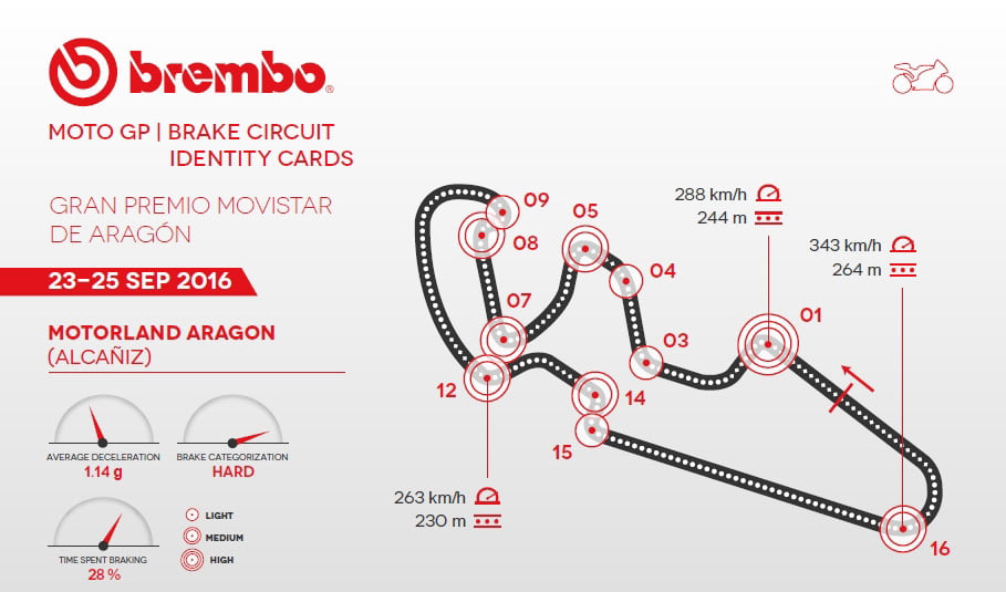 Selon les techniciens Brembo, qui travaillent avec tous les pilotes MotoGP (Brembo est le fournisseur à 100 % des pilotes de la catégorie reine), MotorLand Aragón se classe dans la catégories des circuits très exigeants pour le freinage. Sur une échelle de 1 à 5, il se situe à l’index 4 de difficulté, le même score donné à 3 autres pistes, incluant un autre circuit espagnol, Jerez.