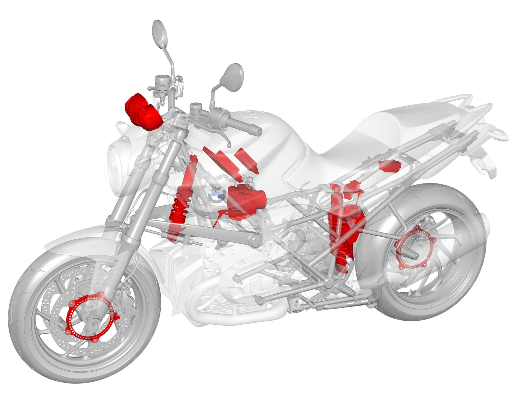 La BMW R1200GS est équipée d’une suspension semi-active. On relève bien sur ce schéma la nécessité de l’interaction entre divers systèmes : amortisseurs, ECU, capteurs de vitesse de chaque roue, etc.