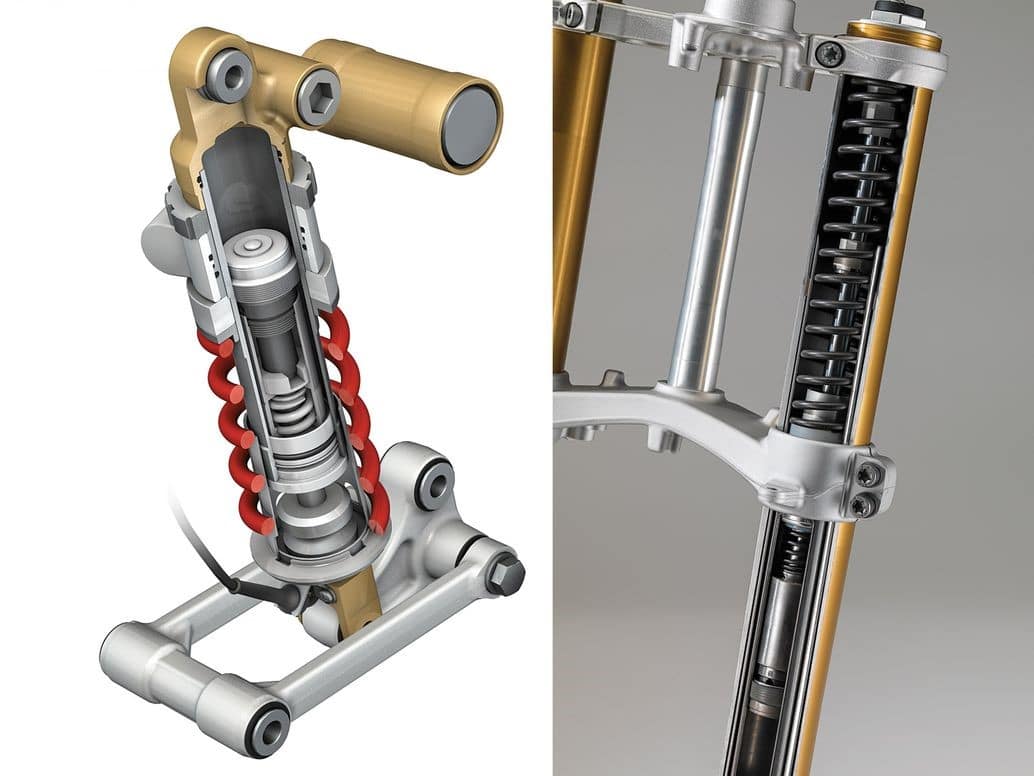 On ne peut pas parler suspensions haut de gamme sans aborder la marque suédoise, Öhlins. Cela fait presque 30 ans que Öhlins a expérimenté pour la première fois la suspension semi-active sur les Yamaha en Grand Prix, mais la technologie est depuis en série. Öhlins a présenté son système mécatronique (mécanique et électronique) à la fin de l’année 2011 pour la BMW R 1200. Dans le même temps, BMW a franchi une étape au-delà de son réglage électronique de la suspension (ESA) et a publié des informations sur un nouveau système de contrôle dynamique de l’amortissement (DDC). La mécatronique et le DDC fonctionnent sur le même principe de base : changer l’action de la suspension en temps réel pour mieux l’adapter aux conditions, sur la base des données collectées à partir de divers capteurs.