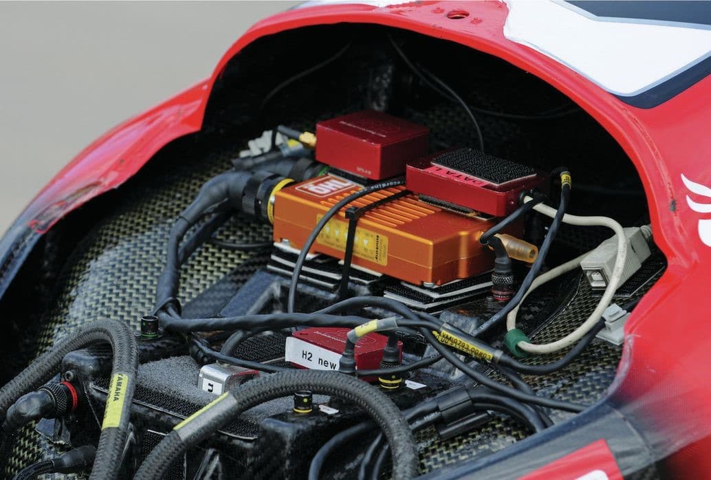 Avec la mécatronique, cependant, les moteurs pas à pas prennent leurs commandes à partir d’un calculateur dédié. Le système a été utilisé pour la première fois par l’équipe Yamaha World Superbike en 2008 (voir image plus bas), et est maintenant proposé en kit pour la R 1200 GS équipée de l’ESA II – qui a une fourche avant Telelever et peut utiliser deux amortisseurs TTX.