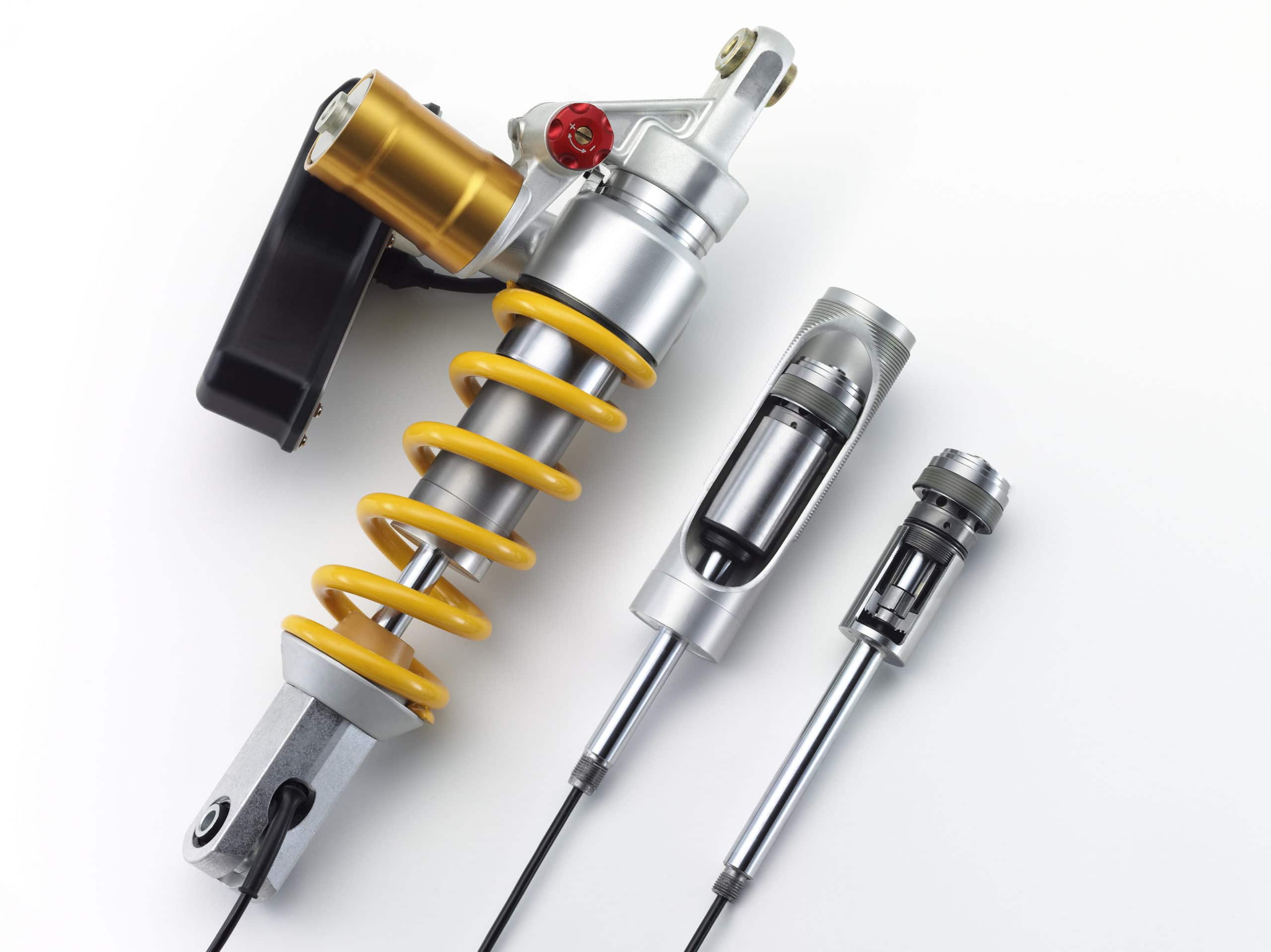 Le système de mécatronique d’Öhlins commence avec les amortisseurs TTX, avec les ajusteurs de compression et de rebond remplacés par de petits moteurs pas à pas. La technologie, surnommée TTX EC (Electronically Controlled), a déjà été utilisée sur les modèles de motoneige Yamaha et fait partie du groupe de suspension électronique de Ducati sur les modèles Multistrada et Panigale (1199 puis les V4), qui permet au pilote de modifier les paramètres via le tableau de bord. La R1M est également équipée de ces amortisseurs dorés.