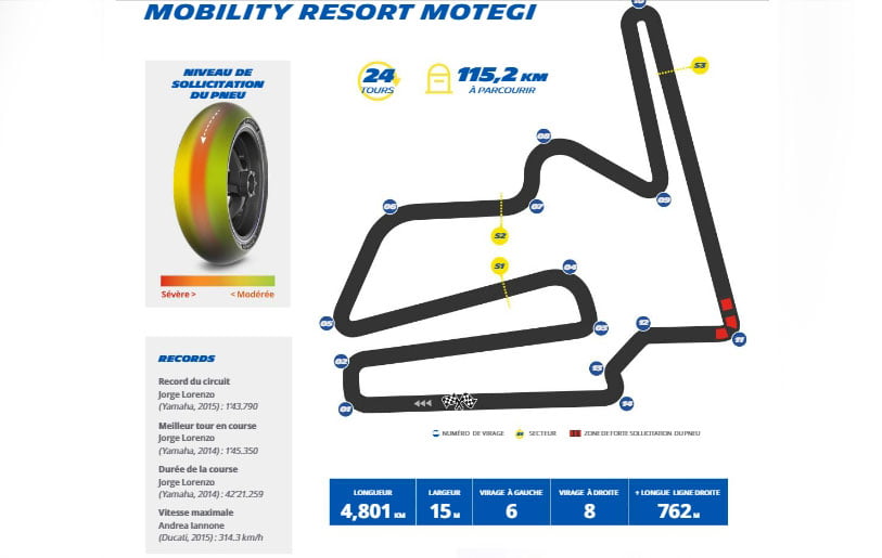 Première étape de quatre courses dans la région Asie-Pacifique, le circuit de Motegi est une piste qui présente des zones de freinage dures et de grandes zones d’accélération, le tout sur une surface abrasive supérieure à la moyenne. Le tracé du circuit de 4 801 m comprend quatre lignes droites distinctes, ce qui signifie qu’une grande partie du temps est consacrée au centre du pneu, mais en raison du nombre limité de virages rapides et fluides, les pneus arrière ne sont pas autant sollicités que sur certains autres circuits.