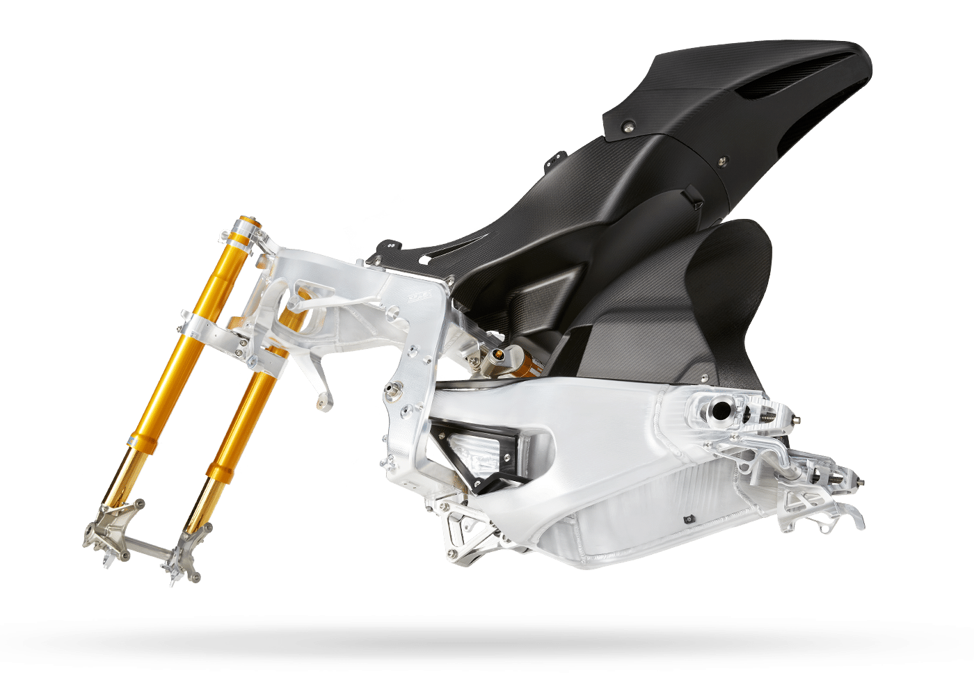 En regardant vers le bas sur le châssis Kalex, on est frappé par combien l’épaisseur de ses poutres latérales se rétrécit. Cet effilement place la majeure partie de la flexion à l’arrière des poutres.