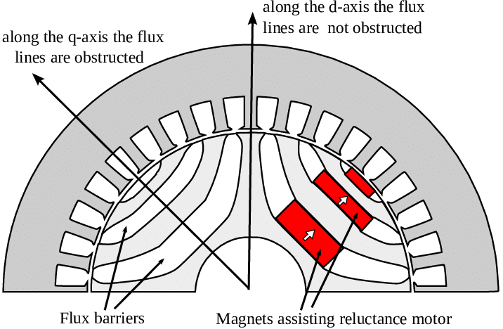 Le couple moyen du moteur SynRM est dû à l’anisotropie du rotor obtenue au moyen d’un grand nombre de barrières à l’écoulement (entrefers). De petits aimants permanents sont insérés dans les barrières de flux pour une augmentation de la densité de couple principale et du facteur de puissance.