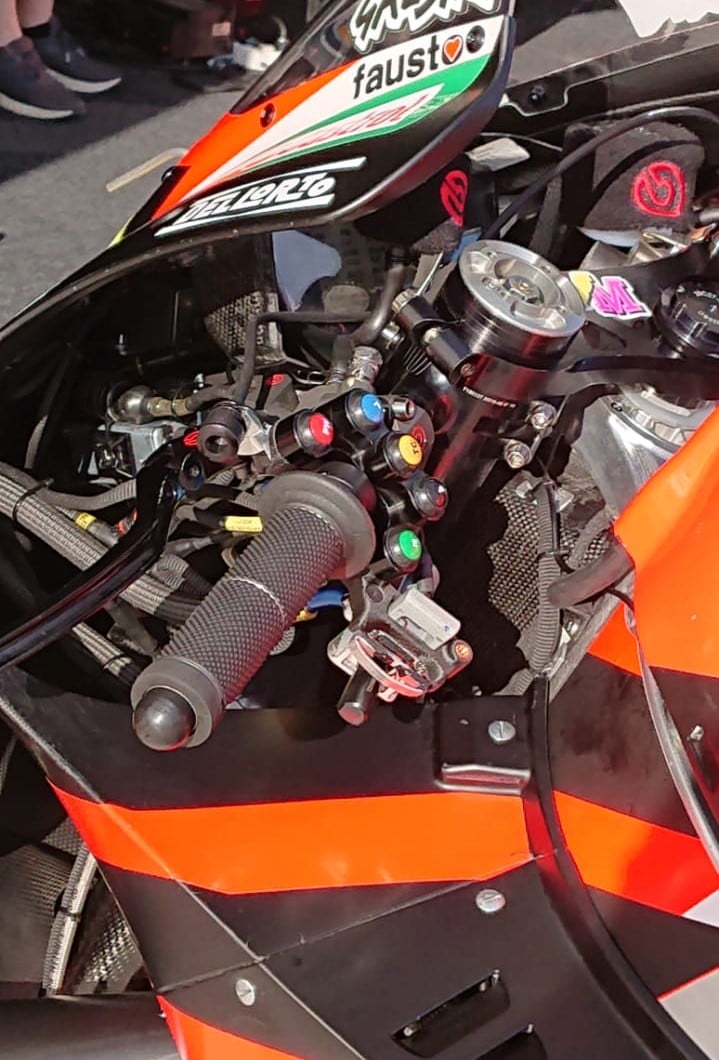 Le Holeshot Device automatique d’Aprilia a récemment fait couler beaucoup d’encre. Sur cette photo, on aperçoit une partie du système nécessaire à son bon fonctionnement, avec notamment la durite bleue, qui passe ensuite dans un tube protecteur noir. Cette durite se dirige vers le réservoir à côté de la fourche.