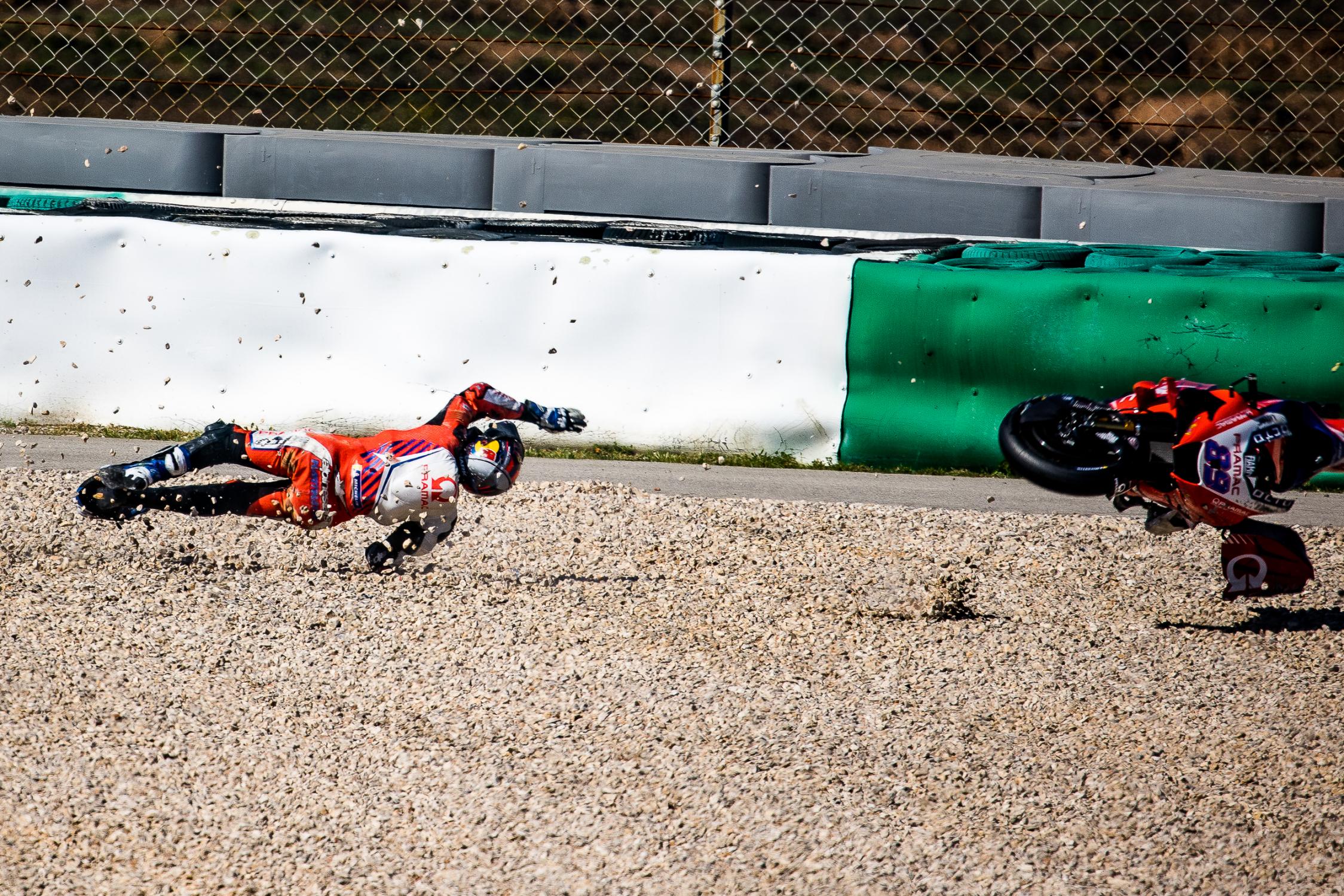 Le pilote Ducati Pramac est tombé de haut en Algarve, il a subi 4 impacts significatifs atteignant des forces de 25G, 2 de ces impacts montrant des forces de 26G. L’airbag est resté entièrement déployé tout au long, ce qui a permis de limiter les blessures.