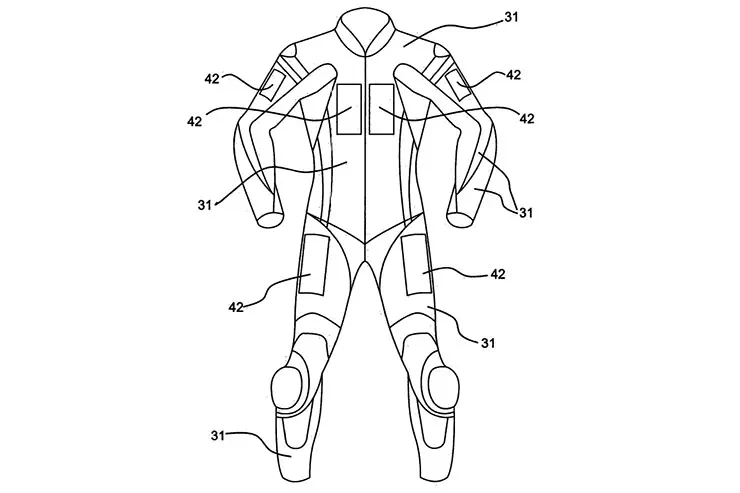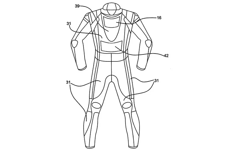 Les écrans sont placés derrière des panneaux en plastique flexibles et transparents, indiqués « 42 » sur les images, cousus sur la surface du cuir. Le brevet montre de petits panneaux d’affichage sur les bras du pilote, avec de plus grands sur la poitrine et les cuisses et le plus grand de tous sur le bas du dos – directement en vue des caméras embarquées.