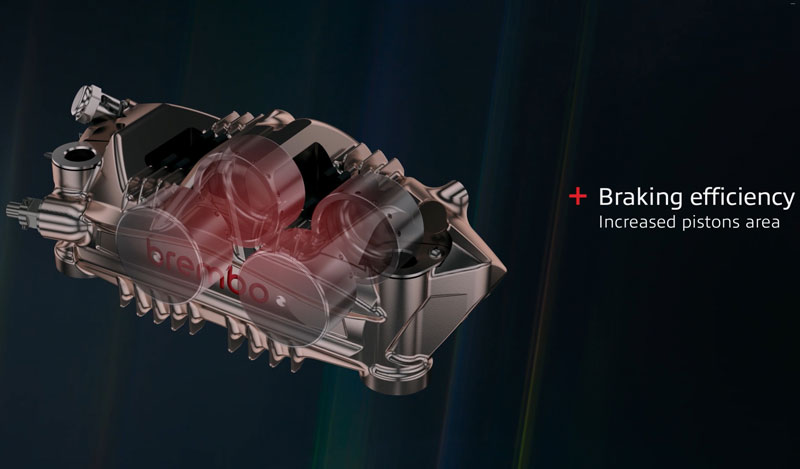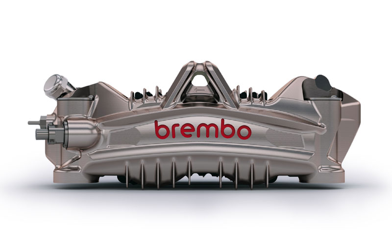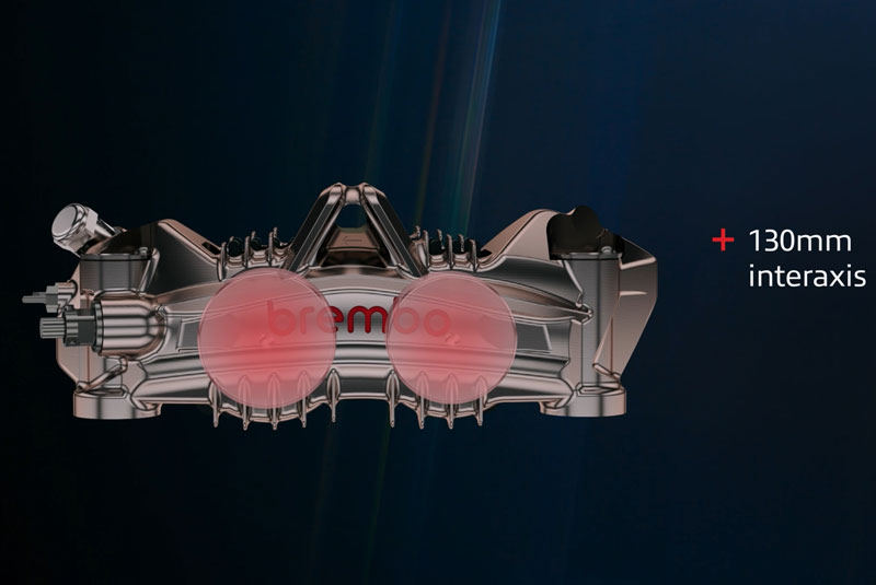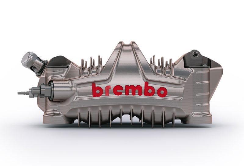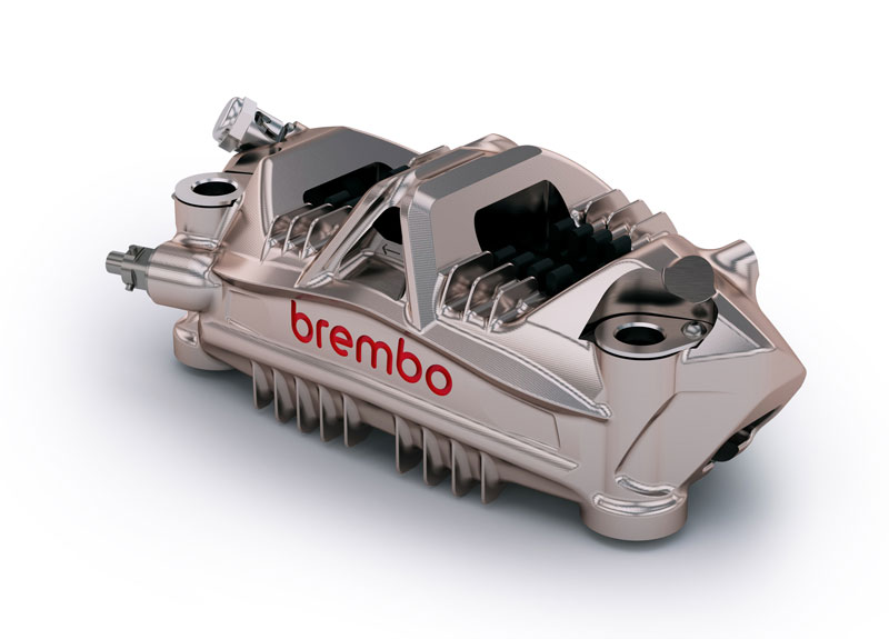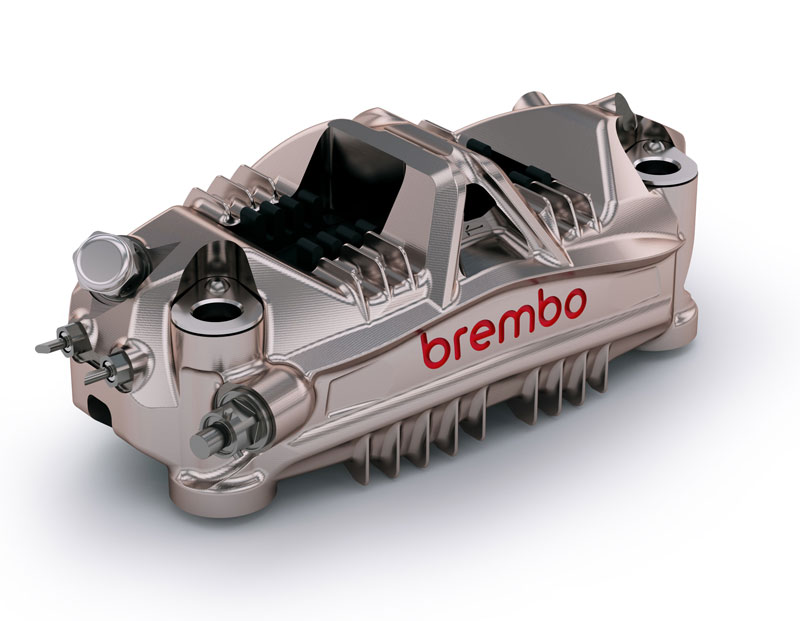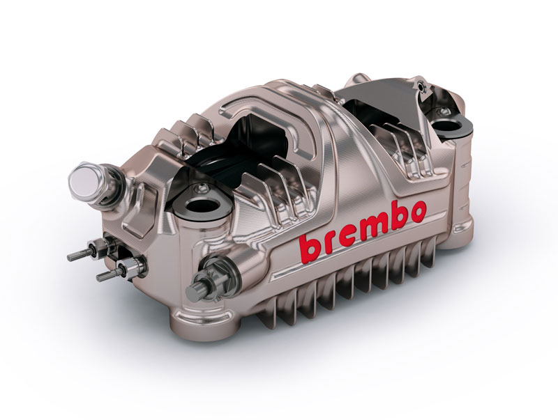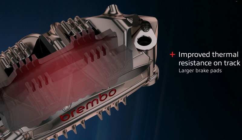 Brembo rappelle qu’actuellement, l’étrier utilisé par les équipes de la catégorie reine est le GP4. Fabriqué entièrement en aluminium et doté d’un design efficace, cet étrier à 4 pistons a toujours offert des performances de haut niveau. L’innovation la plus importante du GP4 est la présence d’ailettes de refroidissement qui améliorent considérablement l’efficacité thermique de l’ensemble du système de freinage. De plus, l’hydraulique optimisée combinée à l’amplification garantit une réponse plus précise et constante au levier de frein, éliminant l’effet spongieux. En substance, au cours de ces quatre années d’utilisation, le GP4 (ci-dessous) a été le symbole d’une avancée significative en termes de puissance de freinage, de modulation et de durabilité.