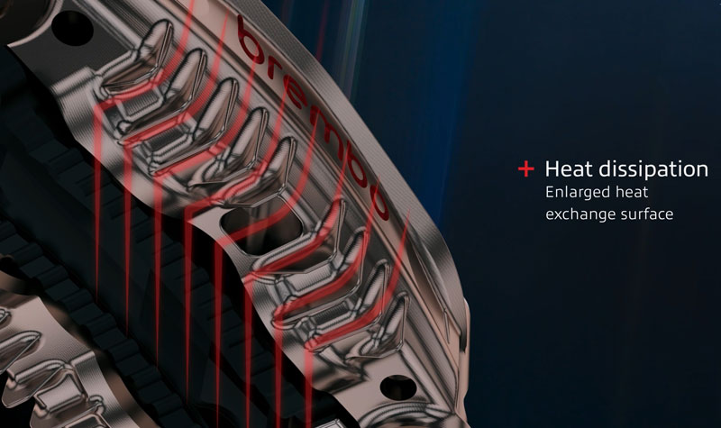 Une plaquette surdimensionnée, capable de résister à des températures extrêmement élevées, assure un freinage constant et puissant, même dans les situations les plus critiques. L’augmentation de la surface de freinage, combinée à une pression de contact optimisée, permet une plus grande efficacité de freinage, permettant au pilote de gérer la moto avec une extrême précision. L’augmentation de la surface d’échange, quant à elle, favorise une évacuation rapide de la chaleur, améliorant ainsi l’usure des plaquettes et garantissant des performances constantes dans le temps.