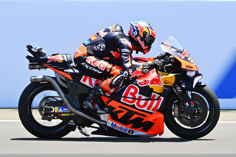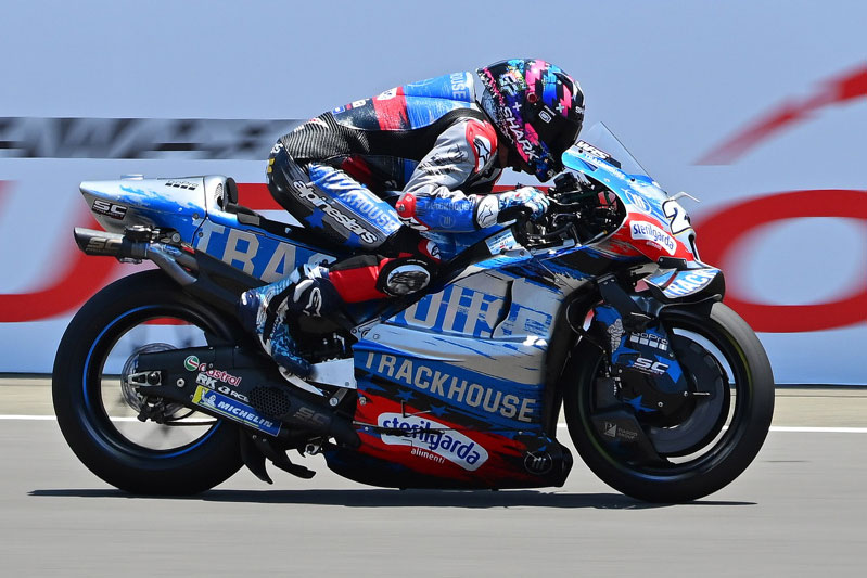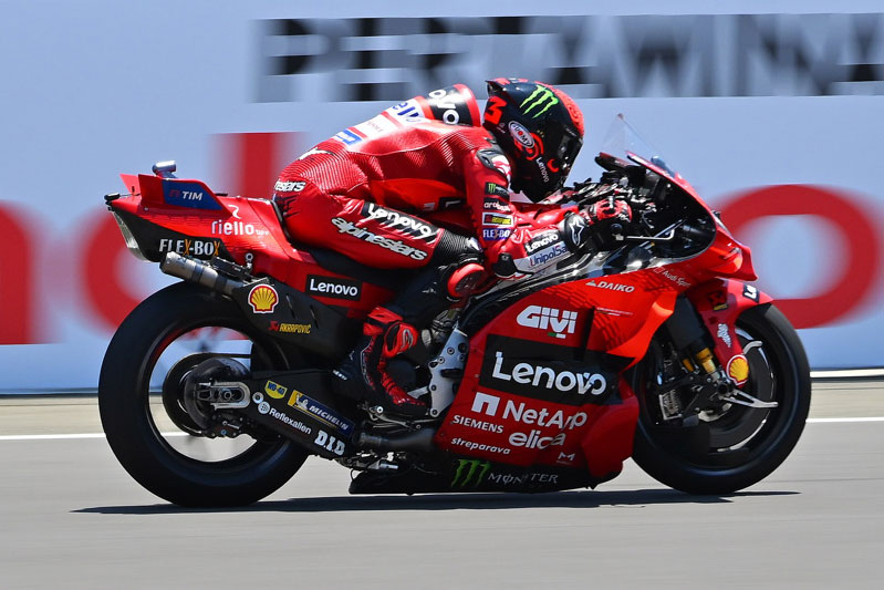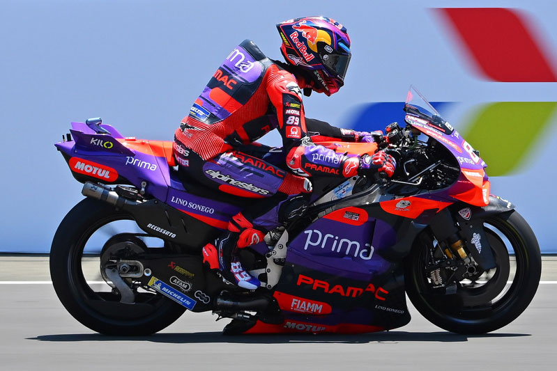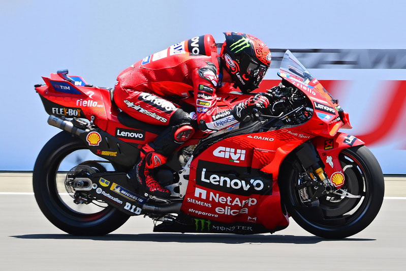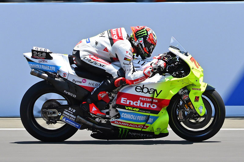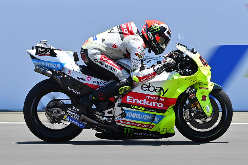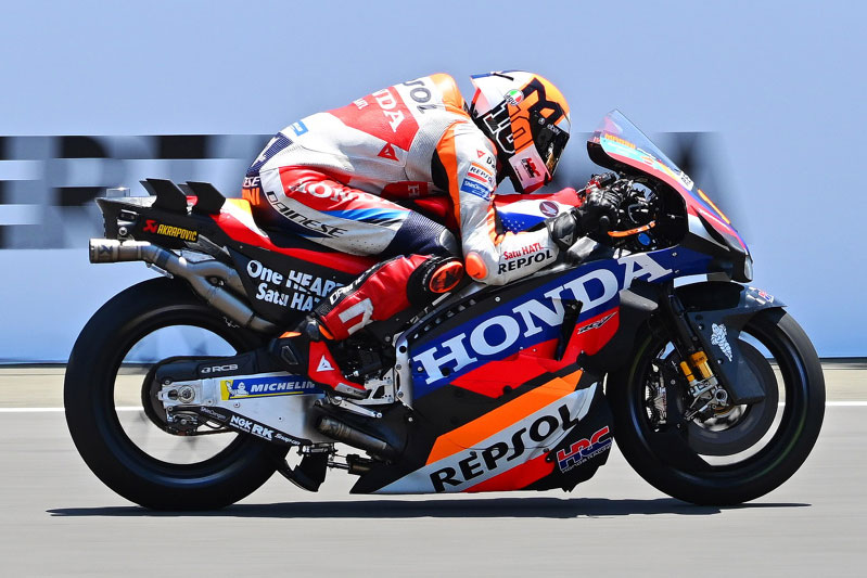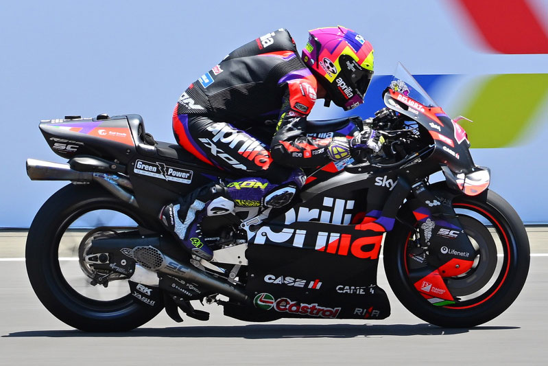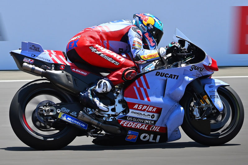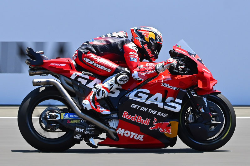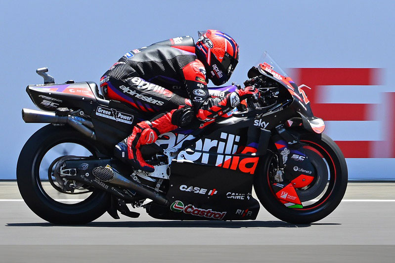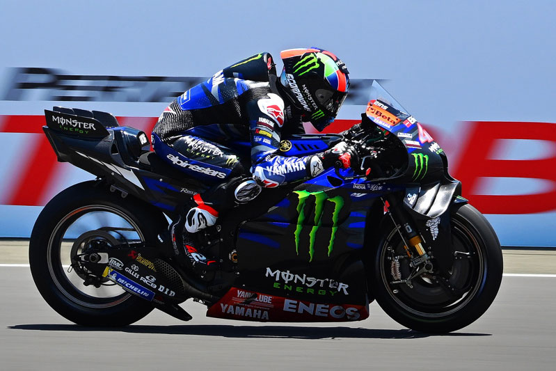 Hier, le photographe de Michelin a su capturer des clichés spectaculaires avec des motos, bien que ne disposant plus de Front Height Device, à l’avant vraiment très écrasé. Ce n’est sans doute pas une conséquence des ailerons toujours plus développés et engendrant un appui de plusieurs dizaines de kilos (autour de 50) sur la fourche, mais plus simplement des photos prises en bout de ligne droite lors des tests de départ, avant que les motos ne freinent et ne désenclenchent le blocage de la fourche….