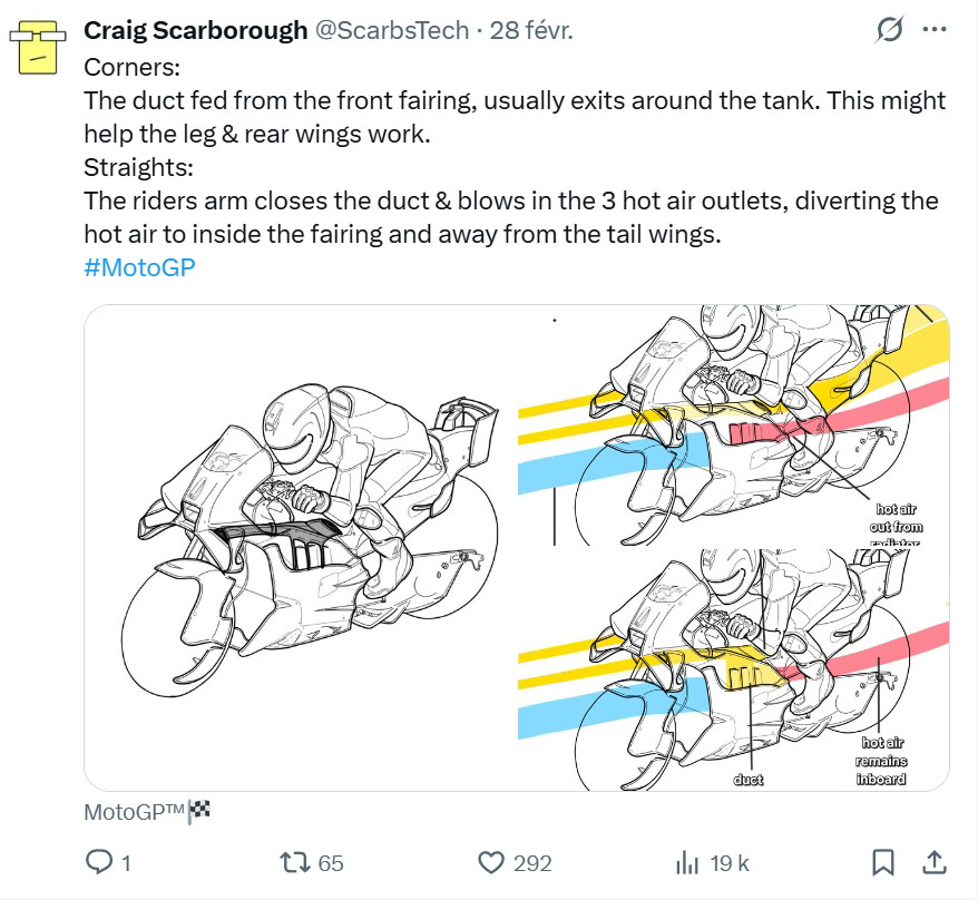 Aprilia utilise pour la saison 2026 du MotoGP une sorte de « F Duct », un élément interdit en F1 depuis plus de 15 ans, et c’est très intéressant, car lors de la première course en 2026, Aprilia a gagné avec plus de 5 secondes d’avance. De là à faire un lien direct, il y a au moins un sujet qui mérite d’être approfondi…