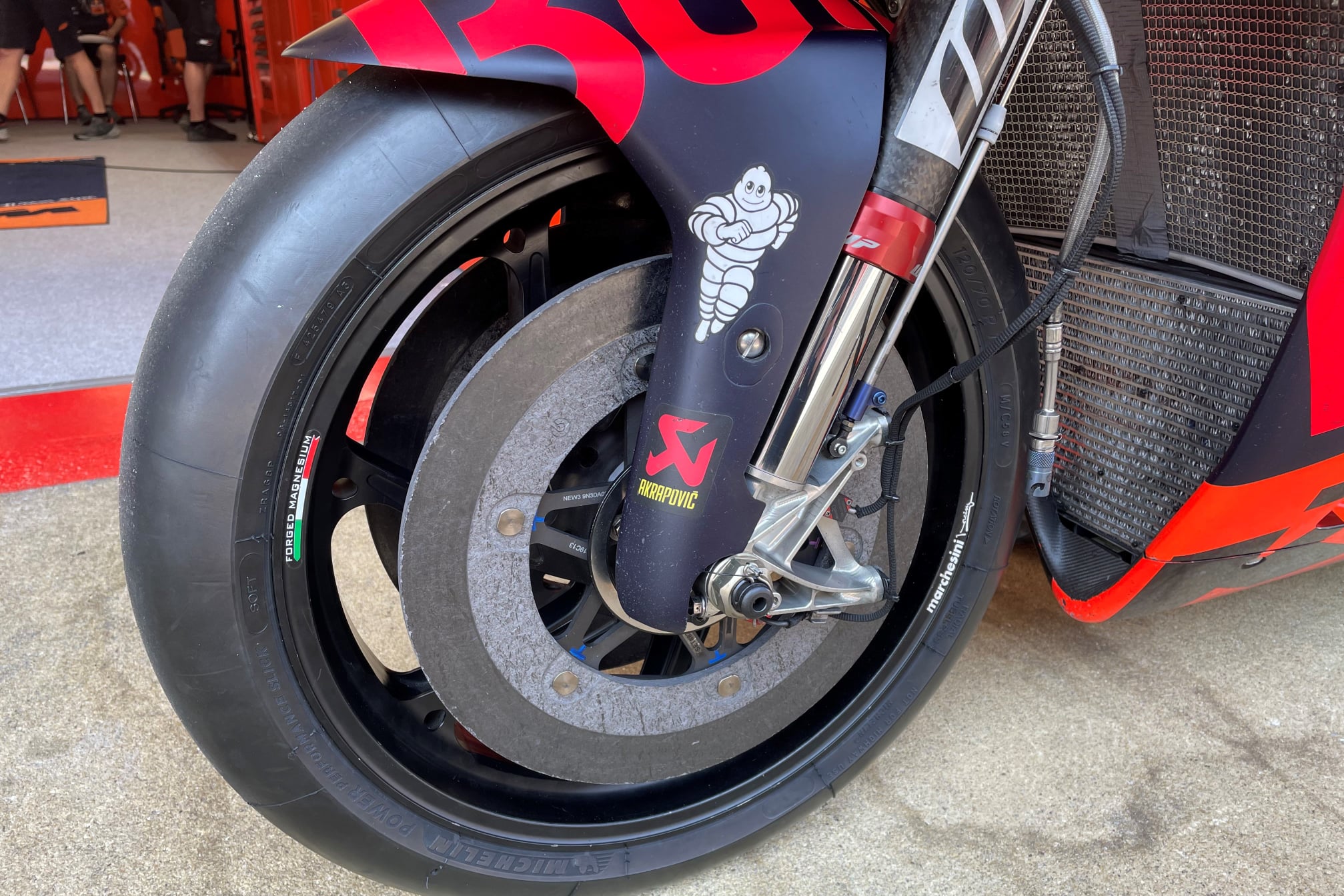 La plupart du temps, nous avons vu les pilotes KTM utiliser les étriers à masse élevée, vus ici sur la RC16 de Brad Binder. Nous savons que la KTM freine assez fort, mettant beaucoup de poids à l’avant, ce qui oblige Brad Binder et Miguel Oliveira à utiliser les étriers à masse élevée juste pour aider à les maintenir dans la plage de température fonctionnement idéale.
