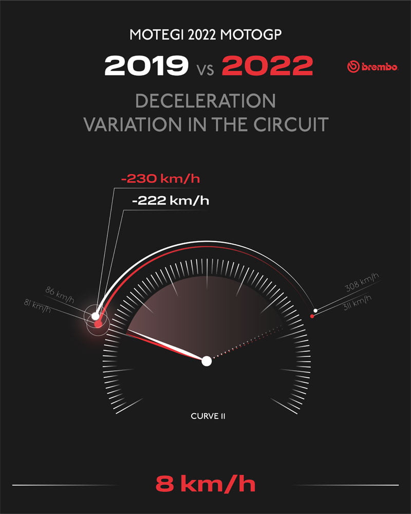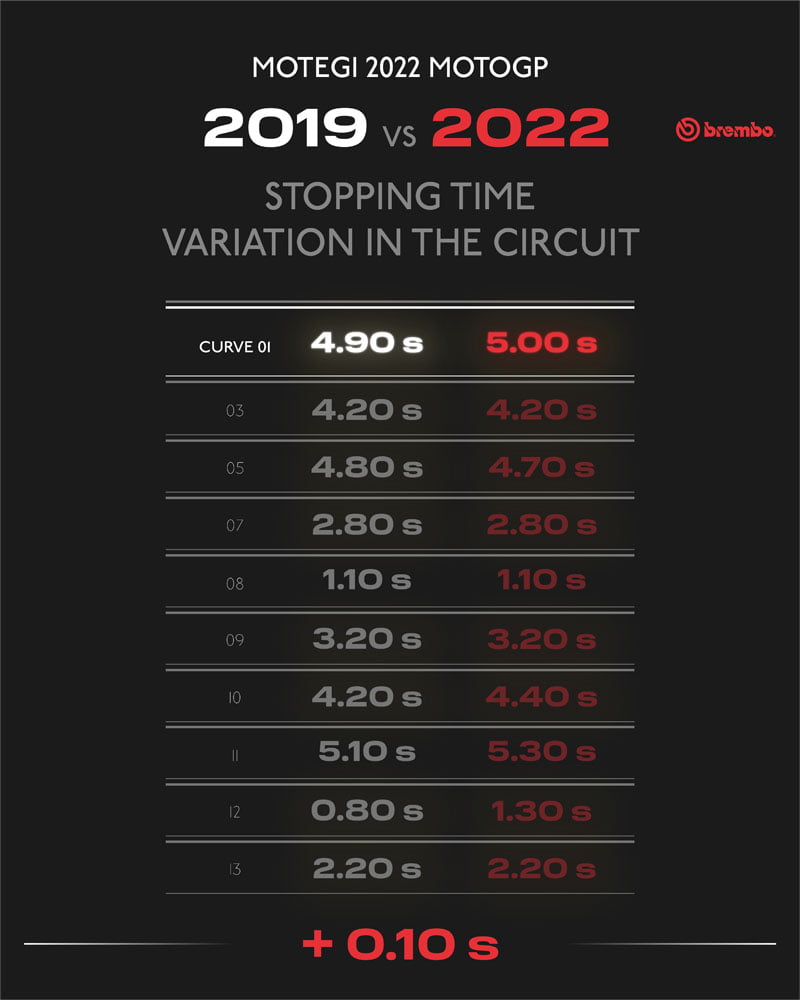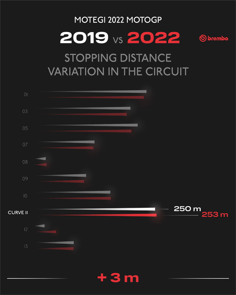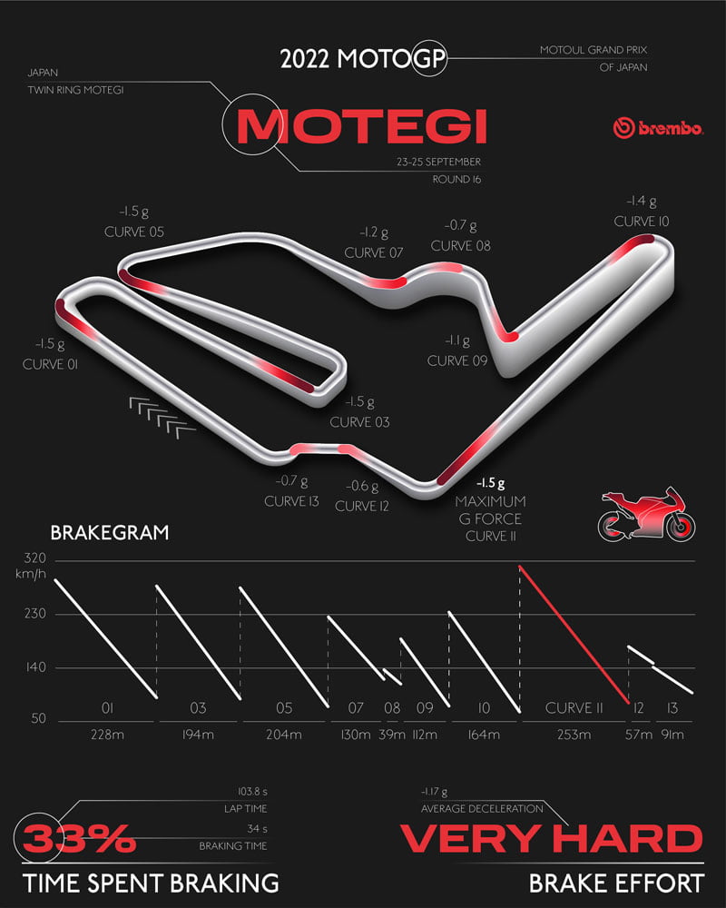 Les freins sont nécessaires dans pas moins de 10 des 14 virages du Twin Ring de Motegi, et dans 5 d’entre eux, ils sont utilisés pendant plus de 4 secondes. Dans le premier virage, le freinage dure 5 secondes, le temps nécessaire pour réduire la vitesse de 228 km/h. En raison de cet épisode de freinage et des suivants, les pilotes MotoGP utilisent leurs freins pendant 34 secondes par tour, soit un tiers du GP japonais.