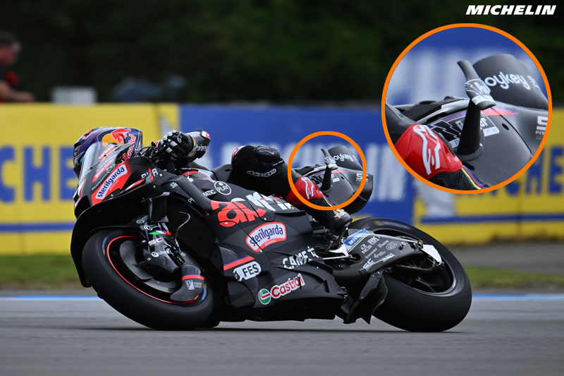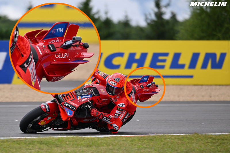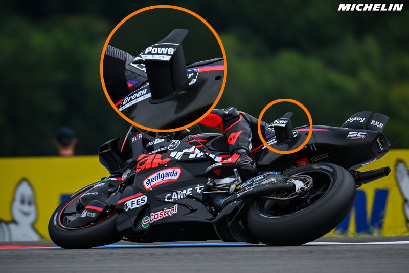 Cette année, les deux marques italiennes ont aussi porté leurs efforts sur les côtés la selle, le seul endroit où l’aérodynamisme n’est pas encore trop réglementé. On a ainsi vu Ducati doter cette année leurs motos officielles d’ailerons latéraux sur le dosseret de selle, immédiatement adoptés par Marc Márquez , probablement pour maximiser directement l’appui sur l’arrière…