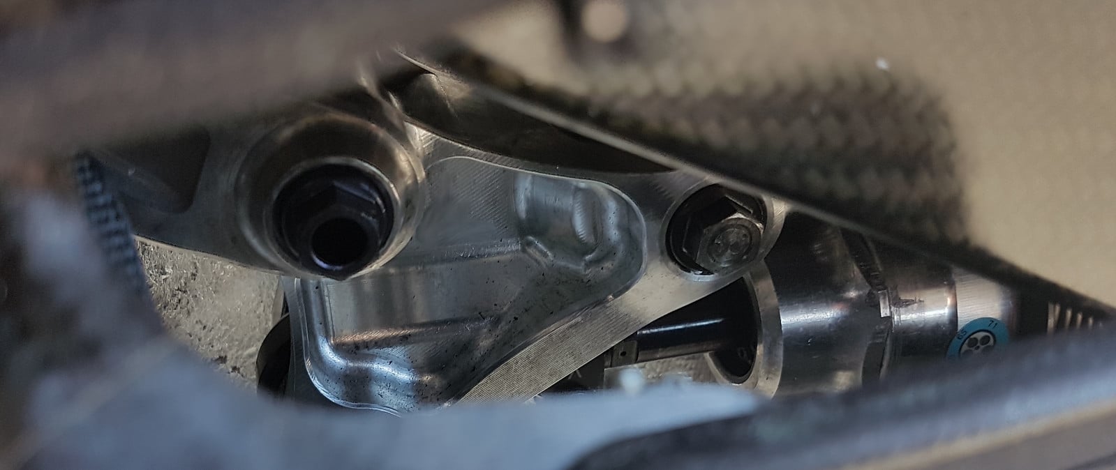 Deux choses sont visibles sur la photo. Tout d’abord, le piston. Il s’agit clairement d’un actionneur, le mécanisme qui permet de modifier la longueur de la tringlerie de suspension avant le départ, en abaissant l’arrière de la moto. La seconde, à droite, est un ressort qui actionne vraisemblablement le mécanisme de retour.