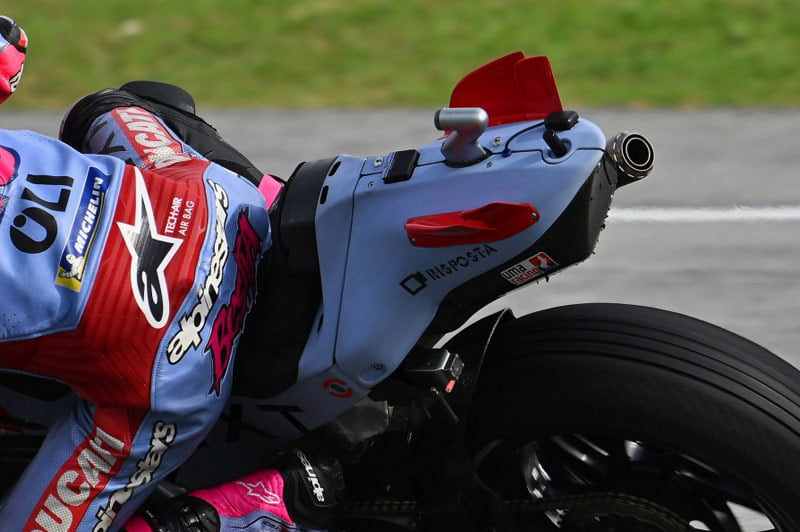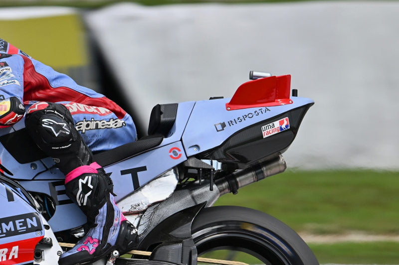Sur la première photo, qui est due à Vaclav Duska Jr et a été publiée sur le site mcnews.com.au (retrouvez-la ici en grande taille), on aperçoit l’arrière de la selle éventrée d’une Ducati du team Gresini Racing à Sepang. On peut donc en déduire qu’il s’agit de la Ducati GP 21 dont Fabio Di Giannantonio a perdu le contrôle lors de la FP3.