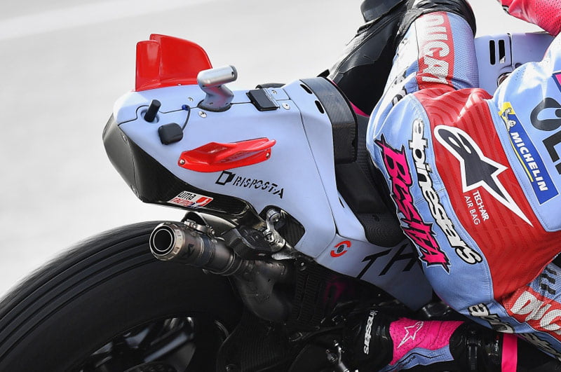 Là encore, il s’agit d’une moto du team Gresini Racing, mais ce n’est pas la même moto, puisque, cette fois, le module TV Dorna Sports est bien présent. On y retrouve la connectique électrique, le moteur de valve et l’accéléromètre… et le fameux Mass Damper. Ou du moins ce qui ressemble à un Mass Damper, avec effectivement une masse coincée entre deux ressorts, mais qui ressemble aussi à un amortisseur de Malaguti des années 70′ : déception ! Déception, car on aurait pu s’attendre à quelque chose de plus sophistiqué !