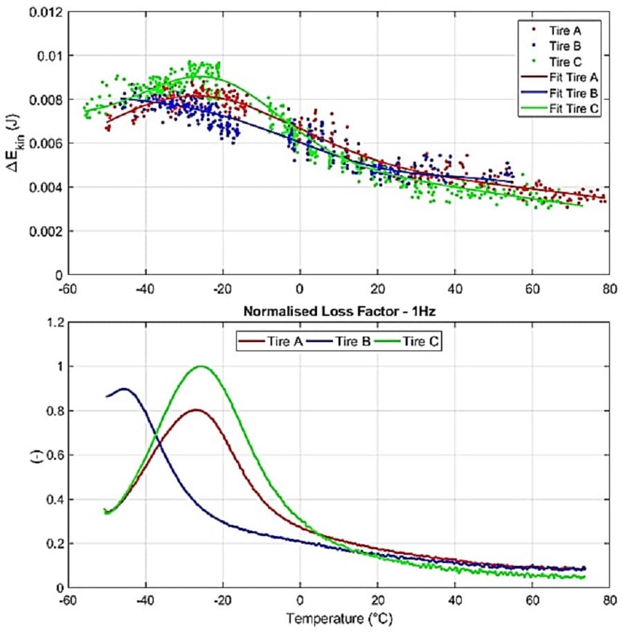 On observe un pic de correspondance avec la température de transition vitreuse à laquelle se produit la perte d’énergie maximale : d’une part, le pneumatique C apparaît caractérisé par un pic de facteur de perte plus élevé que l’autre ; en revanche, le pneumatique B semble présenter la température de transition vitreuse la plus basse, la courbe étant décalée vers la gauche par rapport aux deux autres. La température de transition vitreuse représente la température en dessous de laquelle il y a un comportement vitreux, c’est-à-dire que les mouvements des molécules sont « gelés », limitant tout à de simples vibrations des atomes isolés, mais rien de plus.