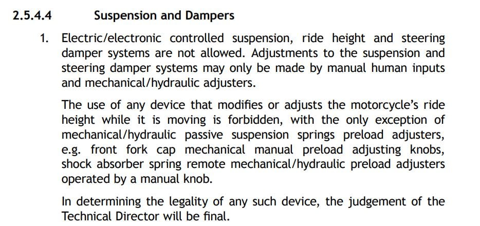 Dans le règlement MotoGP, dont un extrait est disponible ci-dessus, il est stipulé que : « Les systèmes de suspension à commande électrique/électronique, de garde au sol et d’amortisseur de direction ne sont pas autorisés. Les réglages des systèmes de suspension et d’amortisseur de direction ne peuvent être effectués que par des interventions humaines manuelles et des dispositifs de réglage mécaniques/hydrauliques.
