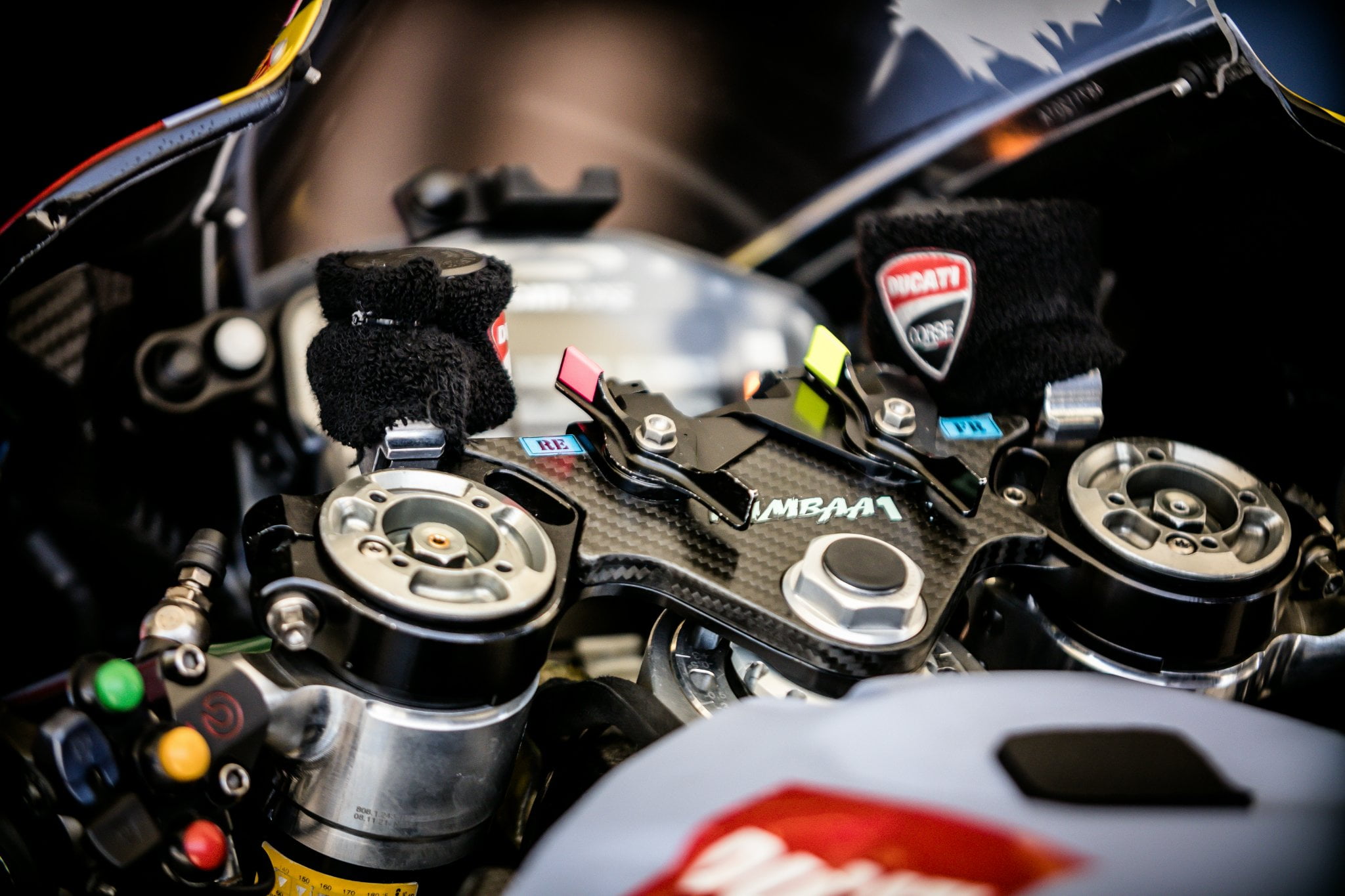 Déjà, lors du Shakedown à Sepang en début d’année, Michele Pirro avait publié une vidéo sur Instagram où l’on observe un détail qui différencie la GP21 de la GP22 : pour activer le Ride Height Device à l’avant et à l’arrière, le pilote d’essai maison n’actionne plus qu’un mécanisme, situé sur le té de fourche supérieur, alors qu’il y a 2 mécanismes sur la GP21 : un pour l’avant, et un pour l’arrière. Dès que le pilote Italien actionne ce mécanisme, on voit immédiatement la réaction sur son prototype : les suspensions avant et arrière s’abaissent instantanément et posent sa Desmosedici à ras du sol.