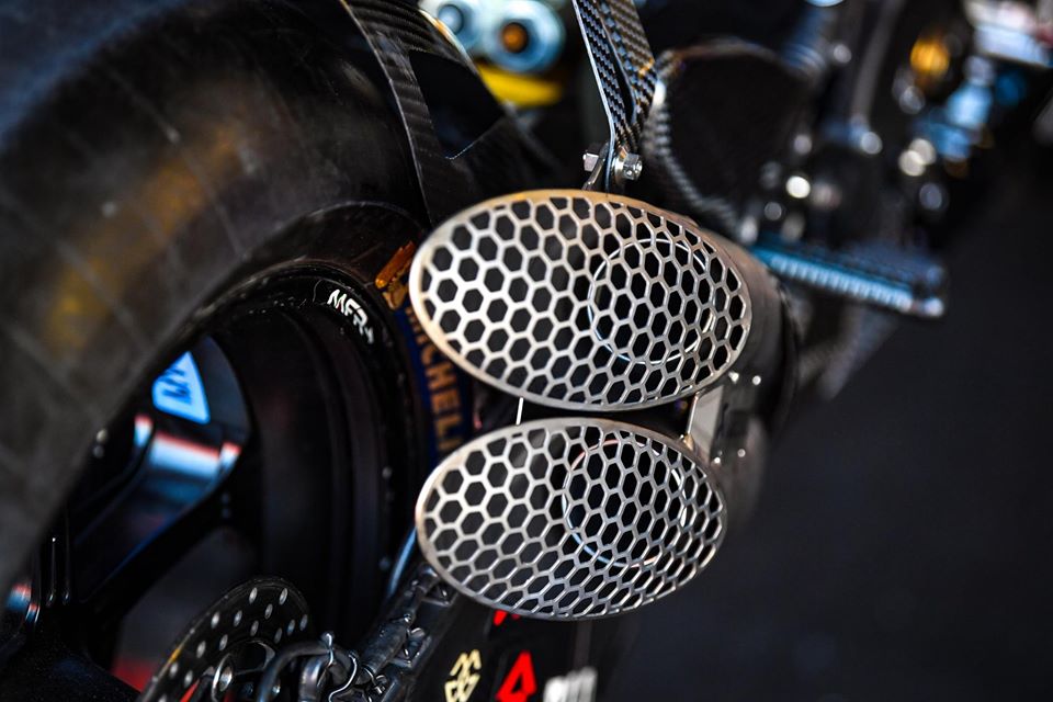 Quant à la grille en forme de nid d’abeille, ce n’est pas un pare flammes, comme on peut souvent l’entendre, mais un dispositif qui permet d’éviter aux gravillons de rentrer dans le moteur lors des chutes, assez fréquentes en MotoGP…