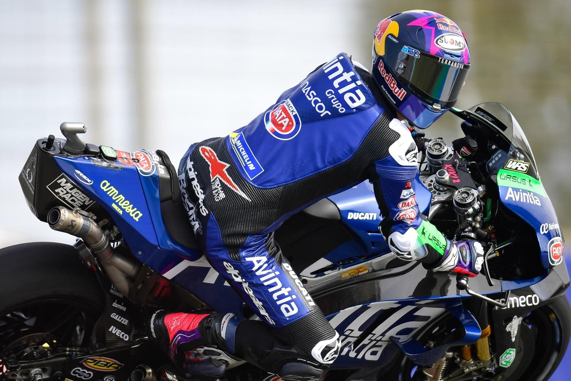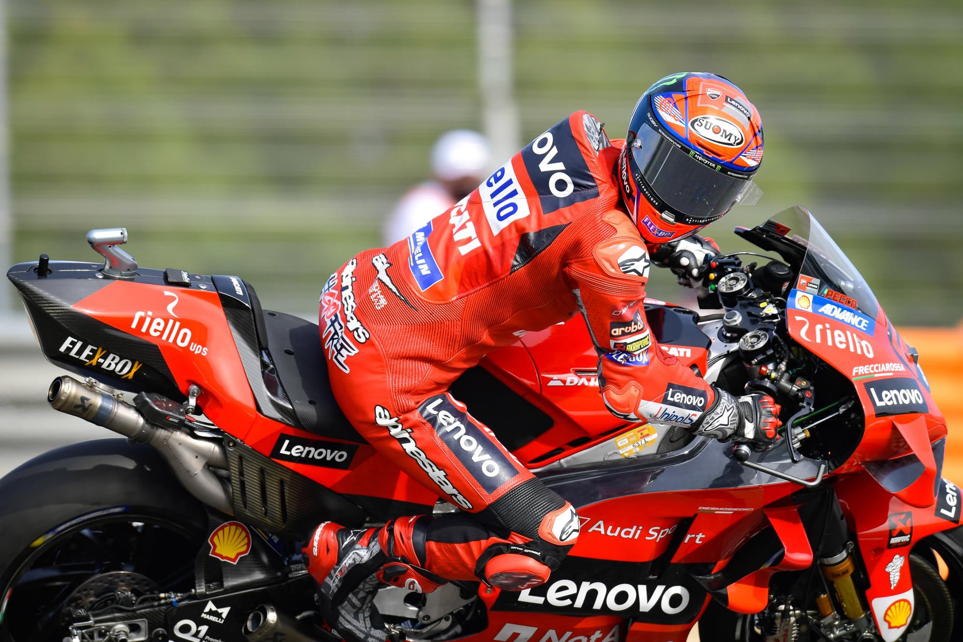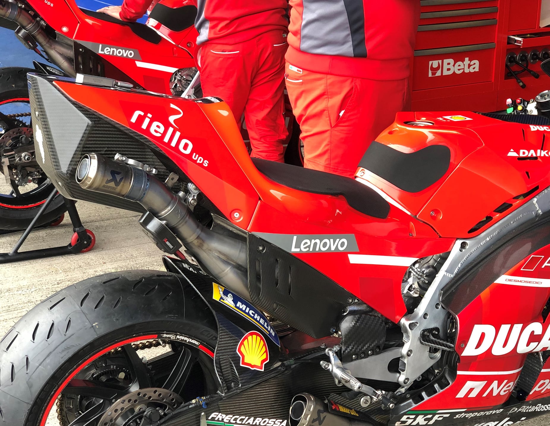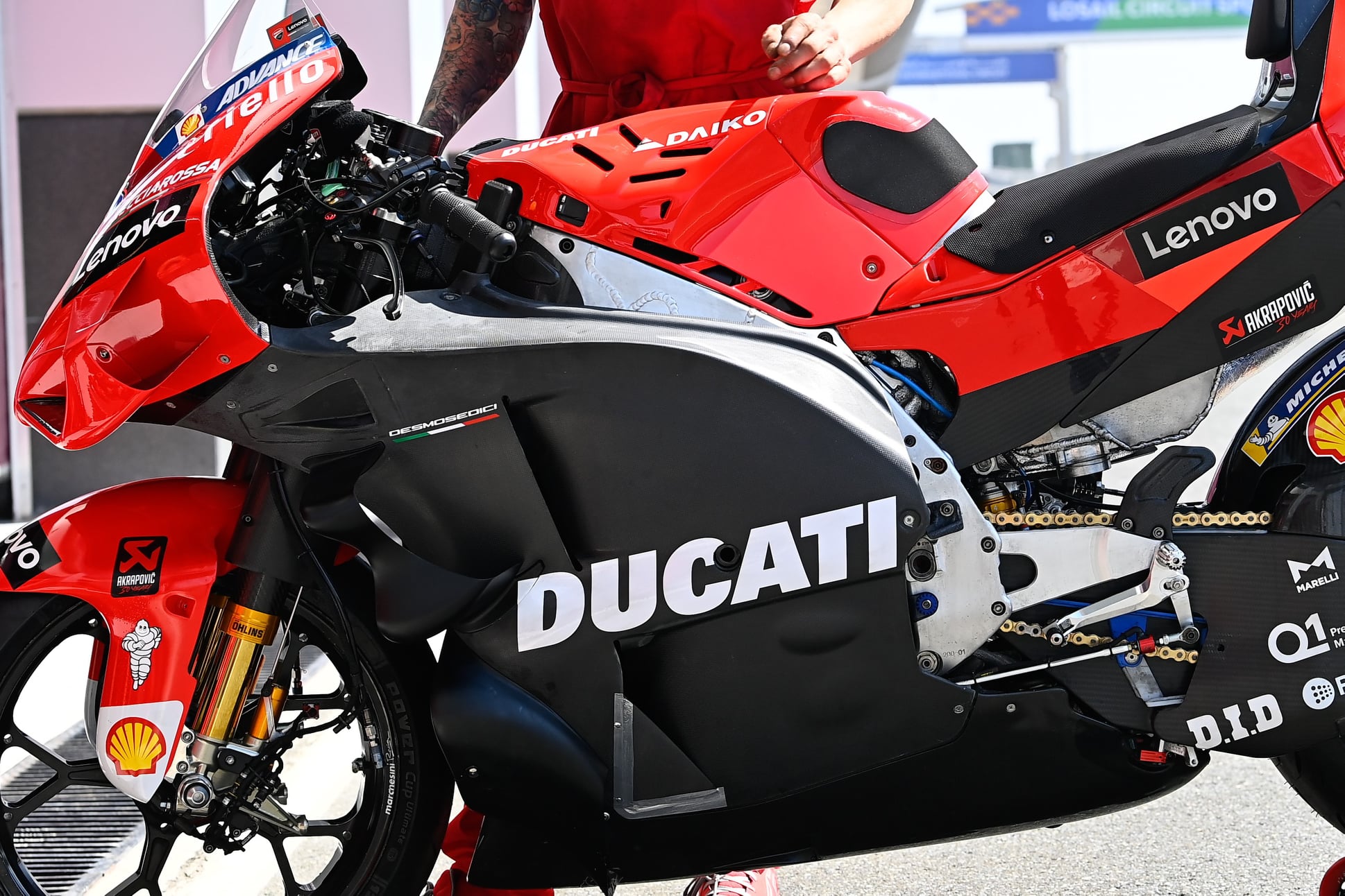 Ici, sur la Ducati GP21 de Pecco Bagnaia, on observe bien 2 leviers sur le té de fourche supérieur. La Salad Box est très différente et l’échappement l’est également.