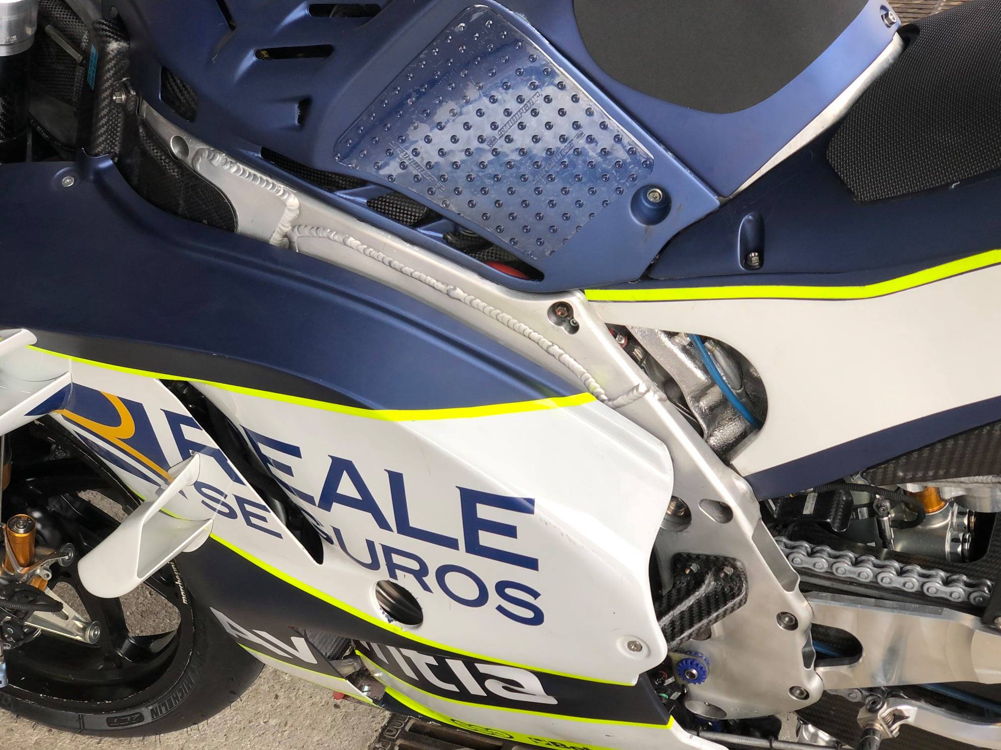 Sur cette photo, il s’agit de la GP19 pilotée par Tito Rabat lors des essais de fin de saison 2019 à Jerez. On observe nettement la grande soudure horizontale sur le cadre. La GP21 est passé de ce type de soudure à une soudure qui traversait verticalement la largeur de la poutre principale. L’idée derrière cela était de trouver plus de flexion latérale à des angles d’inclinaison élevés, permettant au châssis de la moto d’absorber les bosses lorsqu’il est incliné à des angles élevés et d’aider la suspension à travailler.