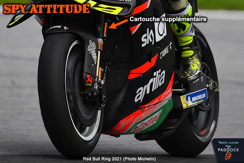 On travaille pour peaufiner le système actuel utilisé à l’accélération mais on aimerait bien aussi pouvoir baisser un peu l’avant en ligne droite, moment où cela n’offre que des avantages (Scx réduit) jusqu’au freinage, moment où la moto doit retrouver sa position « normale ». Pas la peine d’y penser avec les blocages de la fourche par câble, mais c’est peut-être ce qu’a essayé Aprilia lors du dernier Grand Prix d’Autriche. La RS-GP d’Aleix Espargaro était en effet équipée d’une étrange fourche dotée des habituelles cartouches Öhlins en bas, comme toutes ses concurrentes, mais aussi de cartouches supplémentaires en haut.
