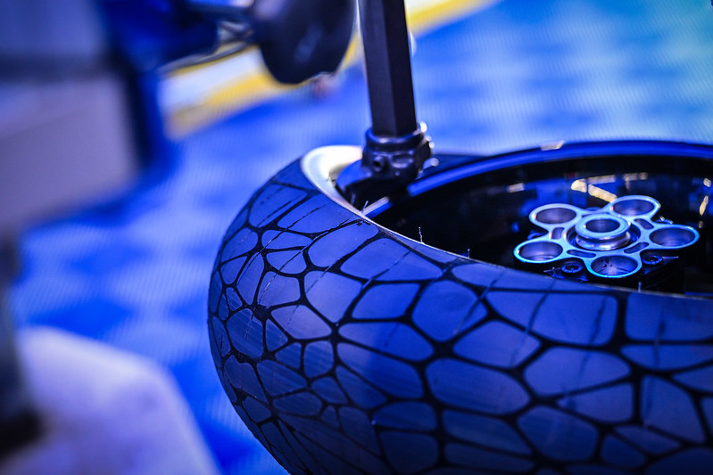 Bidendum a donc décidé de prendre le couteau entre les dents, ou plutôt le poinçon dans le moule, pour modifier l’aspect visuel de ses pneus afin de faire savoir son savoir-faire ! Plusieurs solutions ont sans doute été envisagées pour attirer l’attention sur cette démarche, y compris d’abandonner l’emblématique couleur noire des pneus (Michelin sait le faire), mais c’est finalement sur un design « à l’aspect velours » rappelant les cellules organiques que s’est porté le choix.
