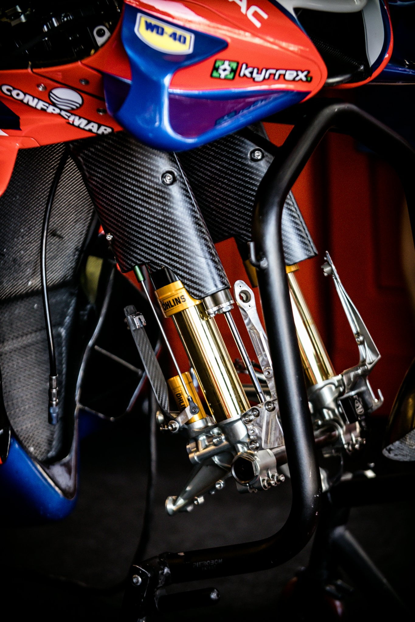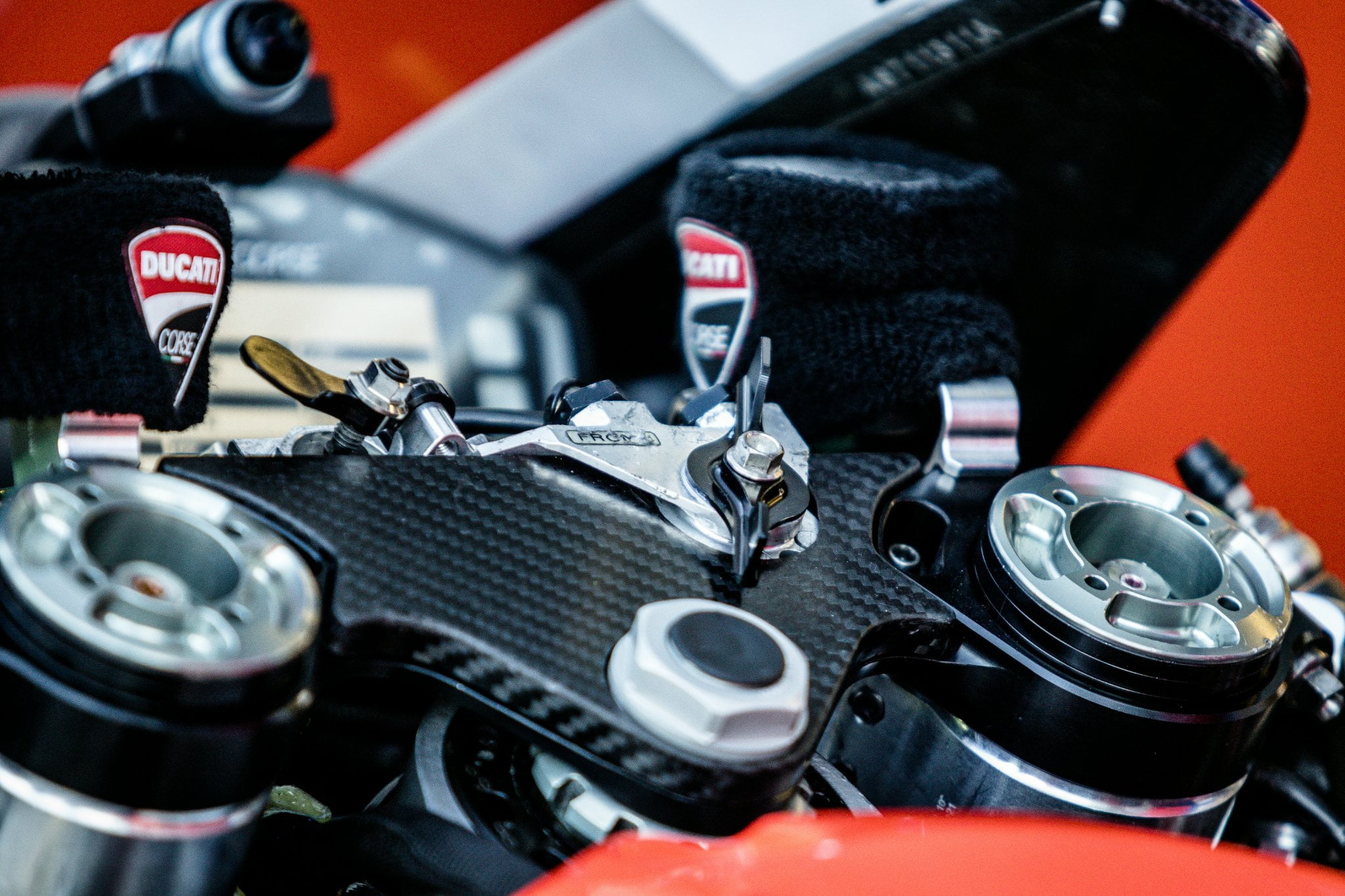 Et voici donc ce fameux système de Ride Height Device avant, visible sur la photo ci-dessus. Le vérin hydraulique se trouve devant le tube de fourche droit et possède une tige qui s’étend jusqu’au bas de la fourche, endroit où est fixé. Les pilotes Ducati l’ont tous testé lors des tests de pré-saison à Sepang, et nous avons notamment à quel point cela permettait à Michele Pirro d’abaisser l’avant en sortant du virage.
