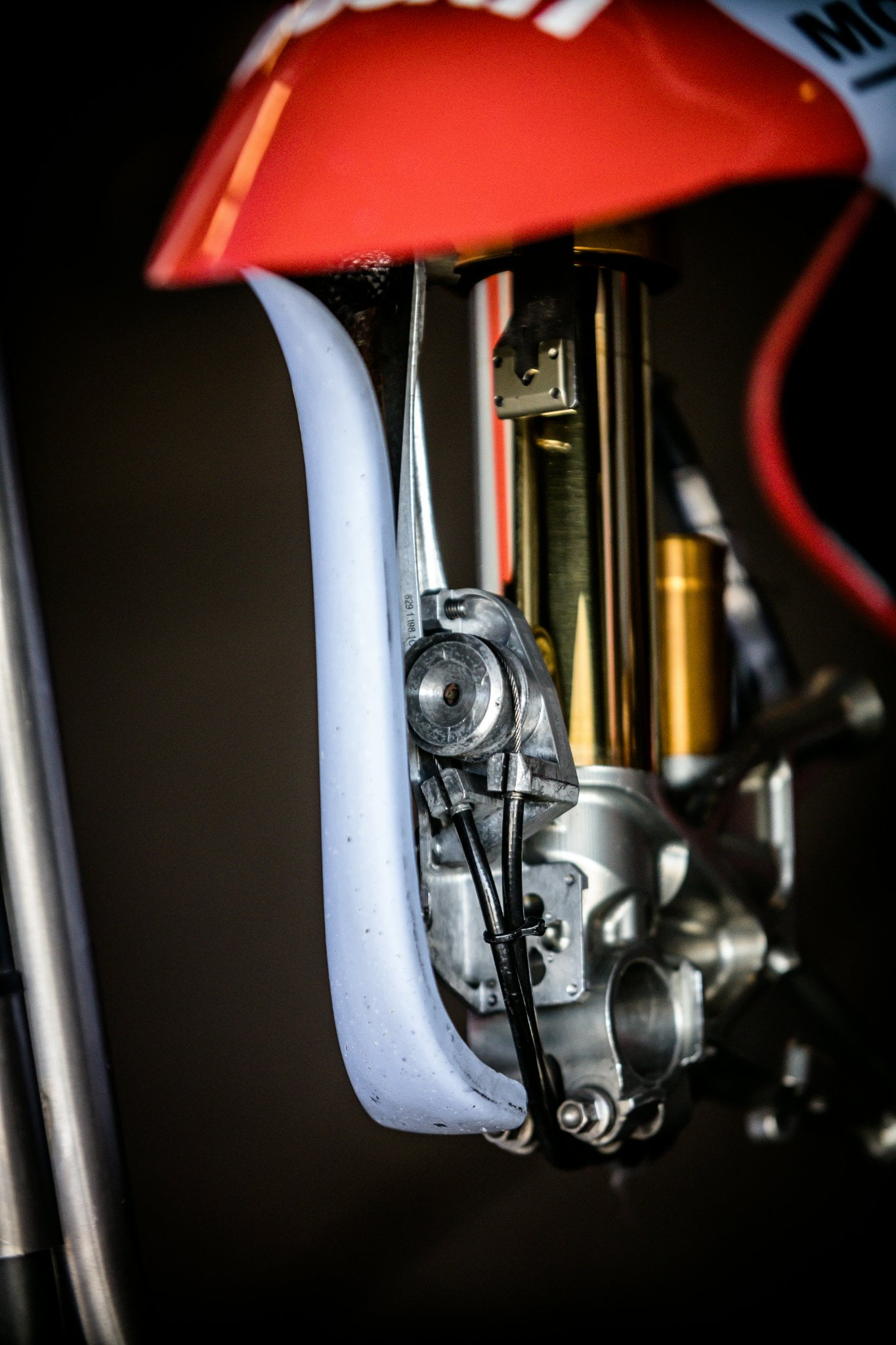 À titre de comparaison, voici la configuration de la GP21. On peut constater que le cylindre et la tige qui en dépassent ne sont pas présents sur le prototype 2021 et qu’à la place, le Holeshot Device se situe au niveau du bas du tube de fourche.