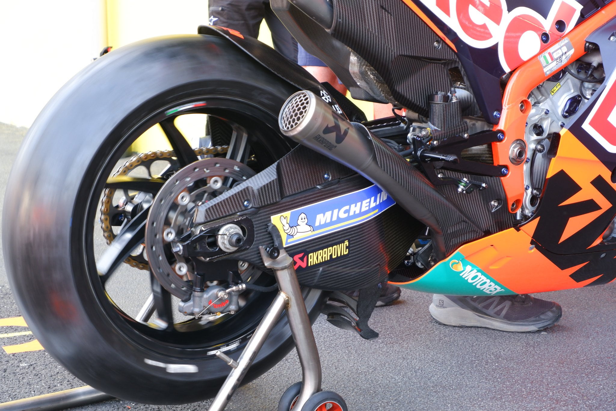 KTM a également essayé un échappement plutôt original lors du test de Jerez, cette année. Bien qu’il s’agissait peut-être davantage d’un exercice de collecte de données pour le futur, il s’agissait sans doute également d’essayer d’ajuster leur puissance pour permettre d’améliorer l’adhérence arrière.