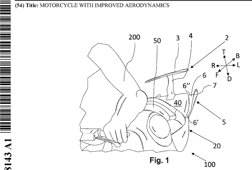 « Un premier but de la présente invention est de proposer une moto comprenant une partie arrière équipée d’un spoiler, ladite partie arrière étant agencée au-dessus de la roue arrière et étant recouverte par un carénage, ledit becquet étant fixé sur le côté supérieur du carénage. De cette manière, le spoiler permet de créer une force aérodynamique sur la roue arrière. Cette force est efficace surtout lors d’un freinage en piste, c’est-à-dire d’un freinage brusque, et est de nature à réduire les rebonds de la roue arrière, améliorant ainsi l’adhérence de la moto et facilitant ainsi l’entrée dans le virage. De plus, la charge plus importante créée sur l’arrière de la moto est utile dans les tronçons droits ondulés, comme une descente, dans laquelle la moto atteint une vitesse d’environ 350 km/h et aurait tendance à perdre de l’adhérence. Cette solution permet également d’améliorer l’équilibre de la moto, et donc l’usure des pneumatiques. Une meilleure adhérence est également obtenue lors du freinage lorsque les deux pneus sont en contact avec le sol. »