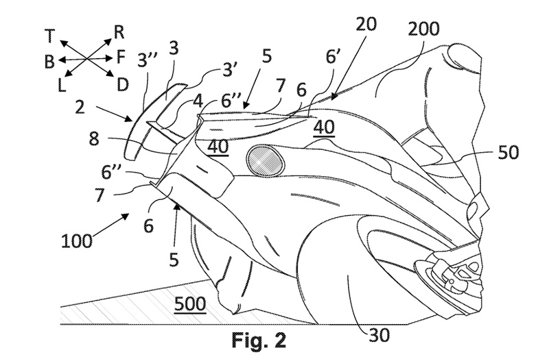 Restant dans le secteur des véhicules à deux roues, mais se référant aux scooters, l’application de ou spoilers latéraux est connu, mais ayant une fonction complètement différente. Des exemples sont divulgués dans les documents EP1944226B1 ou EP1944227B1, qui divulguent un scooter équipé d’un becquet pour éliminer l’effet de turbulence créé par le flux d’air sur le carénage du scooter.