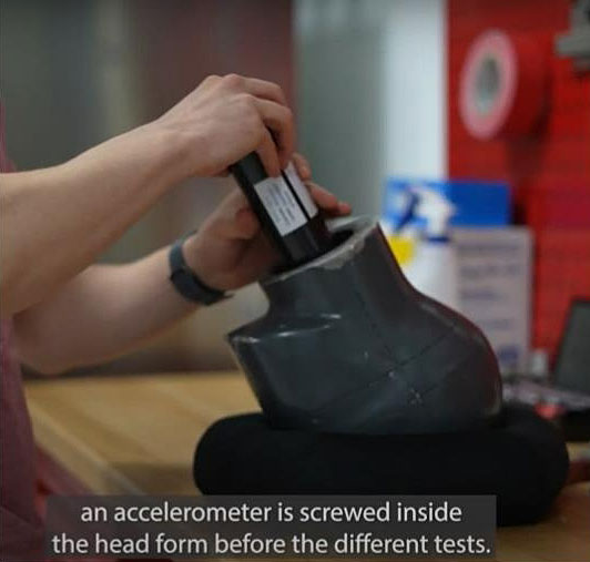 Quand nous conduisons des tests pour l’homologation FIM du casque, il y a une grosse avancée scientifique que l’on a faite quand on a implémenté la phase 1 FIM des casques. Auparavant, avant 2019, scientifiquement, on travaillait essentiellement sur ce qu’on appelle le “SIC”, le Skull Injury Criterion. Donc c’est l’impact mécanique qui va être causé sur la boîte crânienne. Depuis l’implémentation des casques homologués FIM Phase 1 en Juin 2019, nous travaillons sur l’évaluation de ce que l’on appelle le “BRIC”, le Brain Injury Criterion. Ici, ce sont les dommages enregistrés au niveau du cerveau, soit par de l’accélération ou de la rotation autours des différents axes qui vont causer des dommages cérébraux, parfois irréversibles… Je répète mais c’est une avancée majeure, c’est l’un des changements majeurs que nous avons implémenté dans la phase 1 des casques homologués FIM. Dans la tête de frappe pour mener les tests d’impact, on a une cellule inertielle et des accéléromètres qui enregistrent tout ce qui se passe au niveau des différents axes lors des impacts que l’on va mener lors du process d’homologation FIM, sur les accélérations et les rotations qui vont se passer au centre du cerveau. Donc ça veut dire qu’évidemment, d’un point de vue FIM et d’un point de vue medical (et c’est pour ça que la commission médicale est partie prenante du projet), plus on va être proche du centre du cerveau, plus précisément nous pourrons évaluer les différents impacts, les vitesses des accélérations et des rotations que l’on va avoir durant un crash. »
