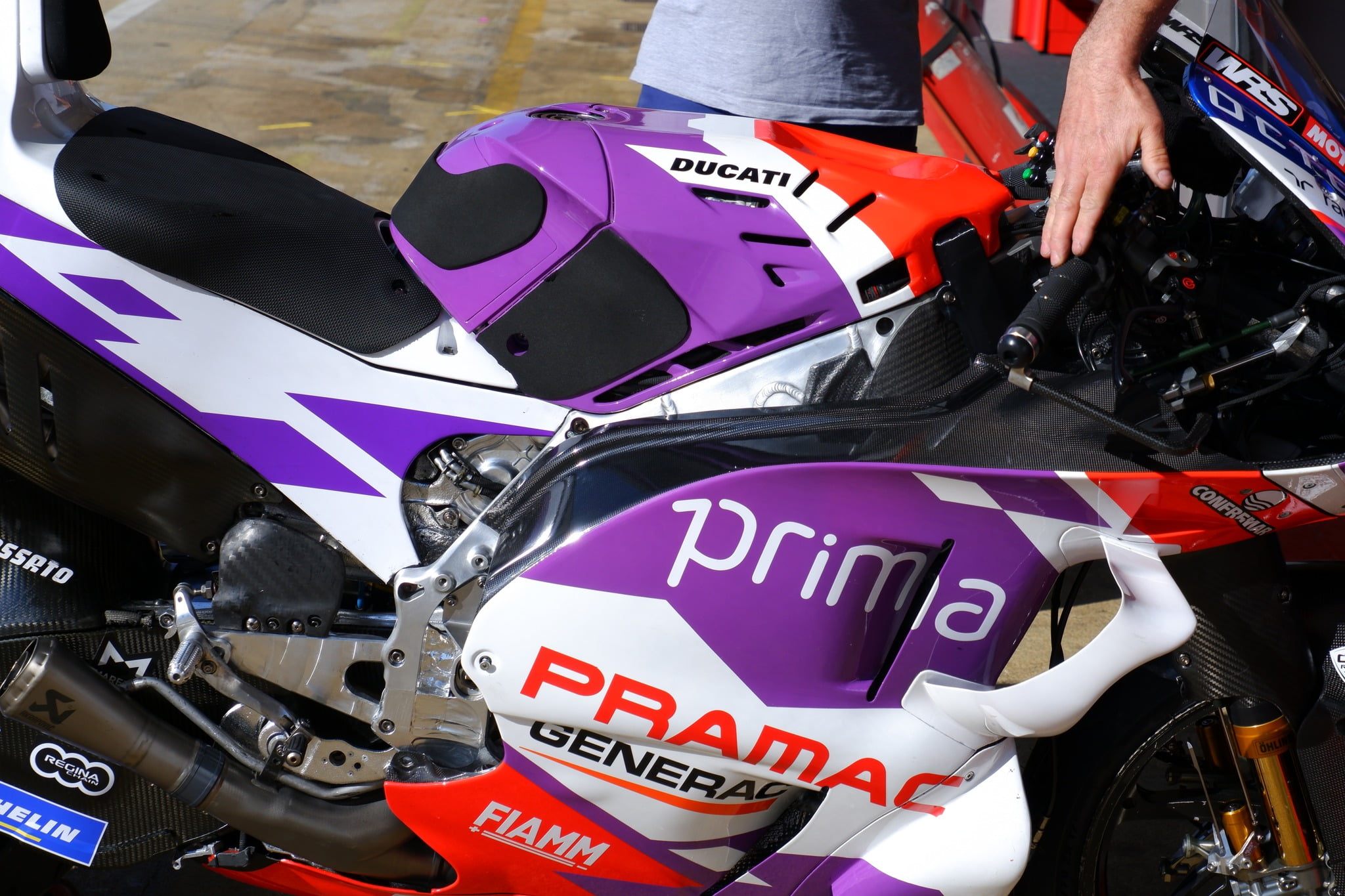 Les évolutions apportées par Ducati sont toujours intéressantes à observer lors des tests, car les ingénieurs de l’usine de Borgo Panigale sont toujours très novateurs. Au test officiel en Catalogne, qui a eu lieu plus tôt dans l’année, un nouveau châssis expérimental a été testé. Sur la photo ci-dessus, en dessous de la zone de pivot du bras oscillant, celui-ci dispose de grandes sections découpées dans le châssis lui-même. C’est très différent du châssis habituel qu’ils utilisent. Il semblait que c’était la première fois qu’ils essayaient ce châssis, mais en regardant de plus près les photos du test de Misano de l’année dernière, il s’avère que ce même concept de châssis avait également été essayé à l’époque.