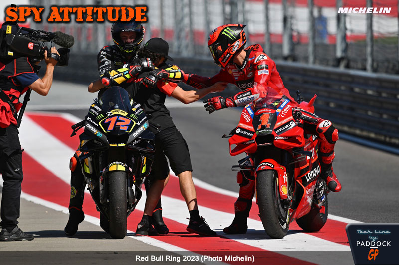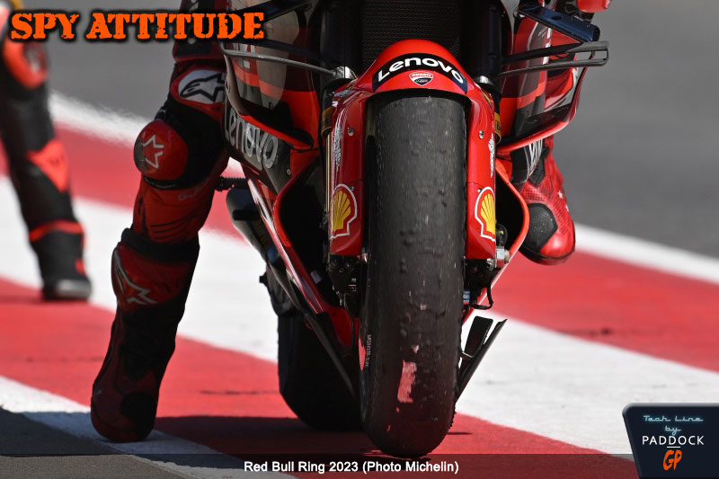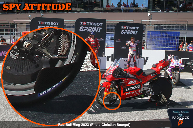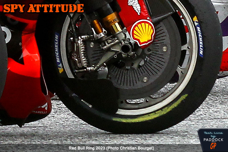 Quoi qu’il en soit, le test a dû être concluant puisque dès l’après-midi, pour la séance pré-qualificative, Francesco Bagnaia les avait sur sa Desmosedici. Curieusement, on remarque aussi que Enea Bastianini ne les avaient plus l’après-midi : n’y en avait-il qu’une seule paire, comme c’est parfois le cas avant de valider un nouvel élément ?