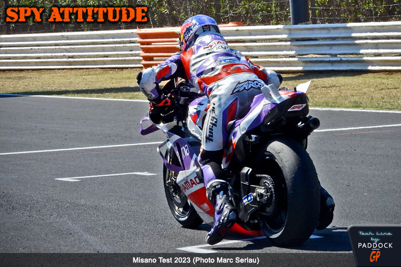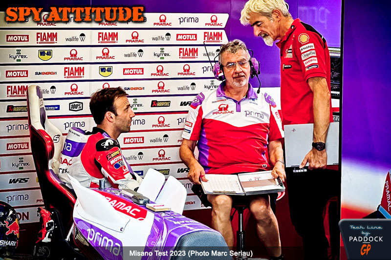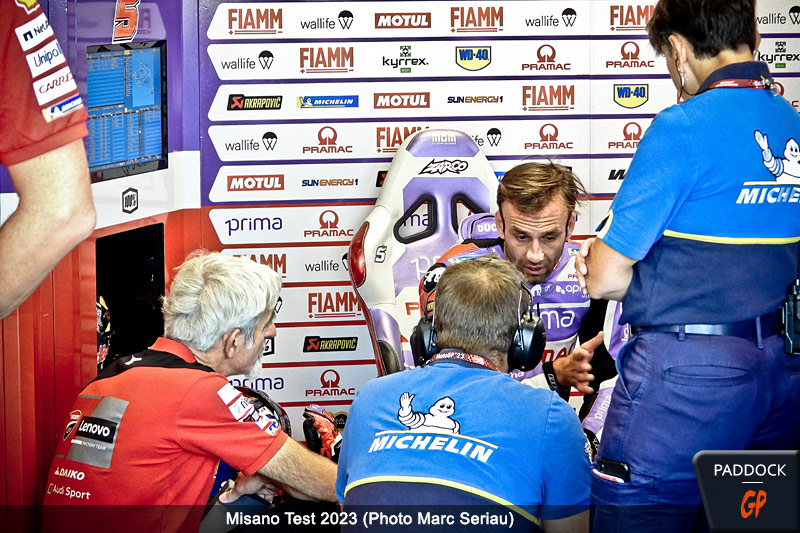 Un Francesco Bagnaia et un Enea Bastianini blessés était l’explication généralement entendue, mais elle ne nous renseignait pas sur l’absence du pilote d’essai à cet avant-dernier test de la saison 2023. Pour autant, on ne pouvait manquer la présence du sorcier latin Luigi Dall’Igna, arpentant inlassablement son ordinateur à la main le box Pramac pour recueillir les propos de Jorge Martin mais aussi de Johann Zarco : sans doute quelques évolutions techniques invisibles étaient à l’essai, mais nous n’en saurons rien, le pilote français ayant décidé de quitter le circuit assez tôt dans l’après-midi sans venir débriefer avec la presse.