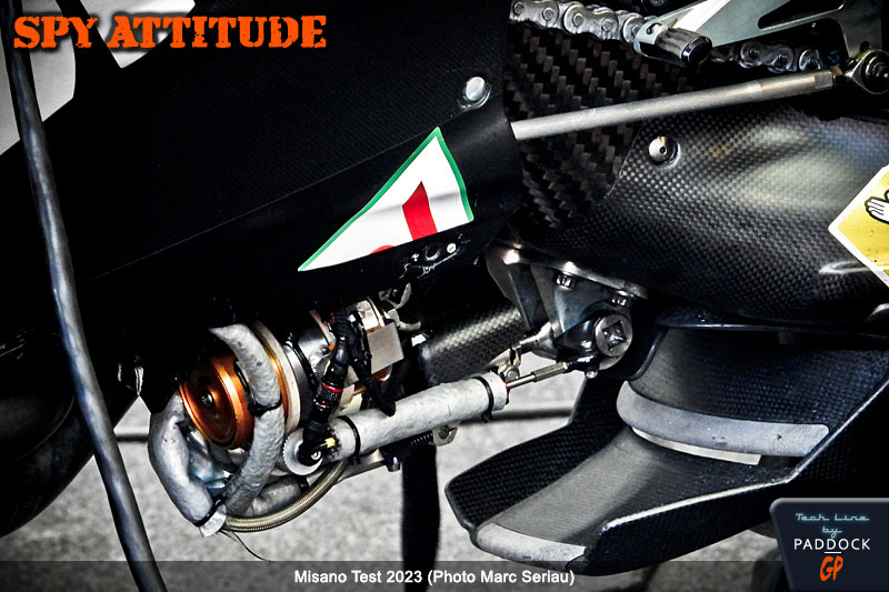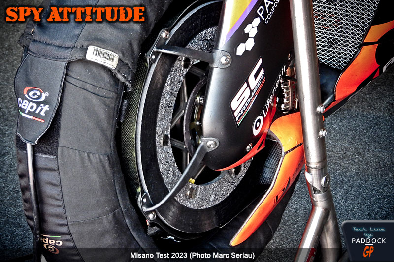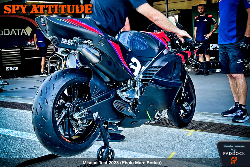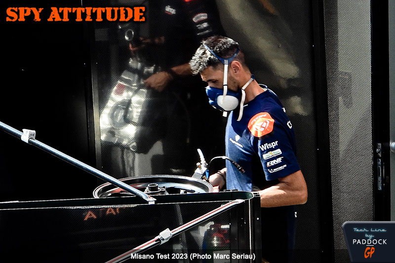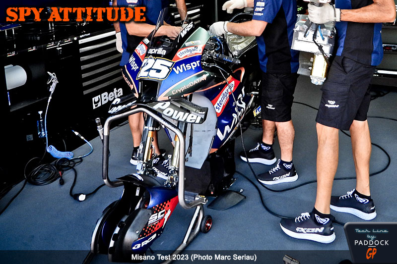 Tout au plus avons-nous vu une RS–GP Factory passer dans le stand RNF pour Miguel Oliveira, mais de cadre carbone, nous pouvons vous assurer qu’il n’y avait point, à l’inverse de la version vénitienne de la protection thermique du pneu avant (façon Yamaha).