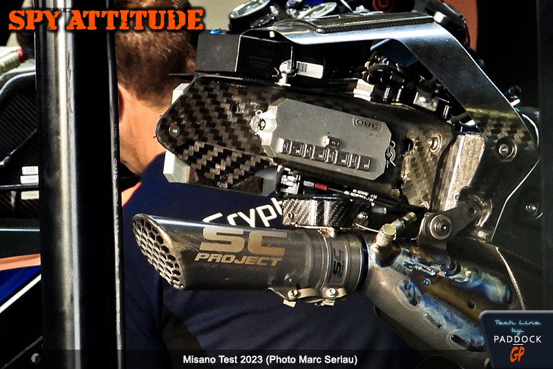 Il faudrait plusieurs photos de bonne qualité pour en être certain, mais on n’y décèle aucune trace visible d’un mass damper, alors que l’on y perçoit au contraire la présence de lest, une méthode plus ancienne pour éliminer les diverses vibrations (vous n’avez qu’à enlever vos embouts de guidon pour comprendre l’importance d’un lest bien placé). Les dispositions entre les motos officielles et satellites sont cependant différentes. Cela ne veut pas dire qu’il n’y en a pas, dans la partie en carbone entre les deux lests…
