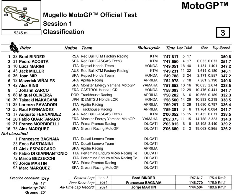 Avec l’apparition d’une nouvelle évolution aérodynamique de la KTM de Pedro Acosta dès le matin dans la pit lane, le test MotoGP au Mugello nous promettait de très belles choses, du moins jusqu’à ce que la pluie fut venue…