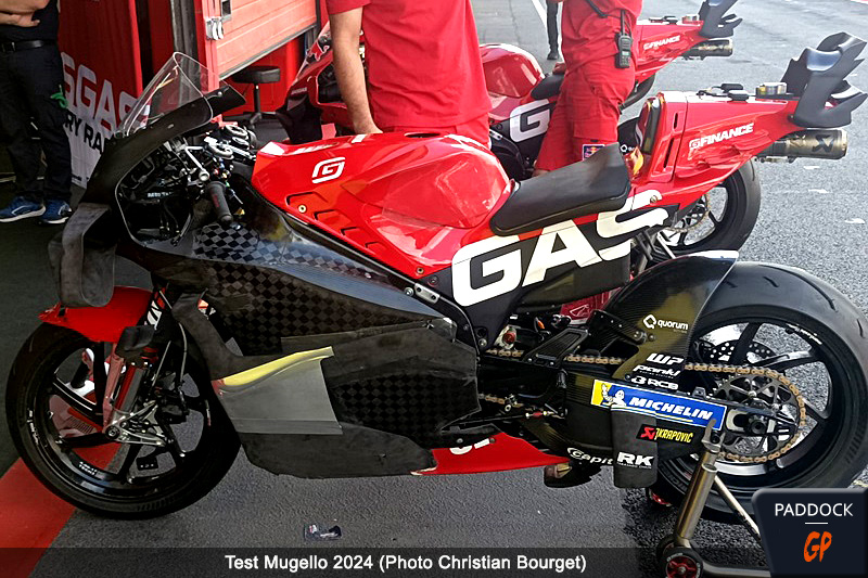 Débuté à 10h00 sur le tracé toscan avec une piste encore humide de la pluie nocturne, le test permettait à notre photographe Christian Bourget d’observer dès le matin une nouvelle évolution de la KTM RC16 devant le box Red Bull GASGAS Tech3.