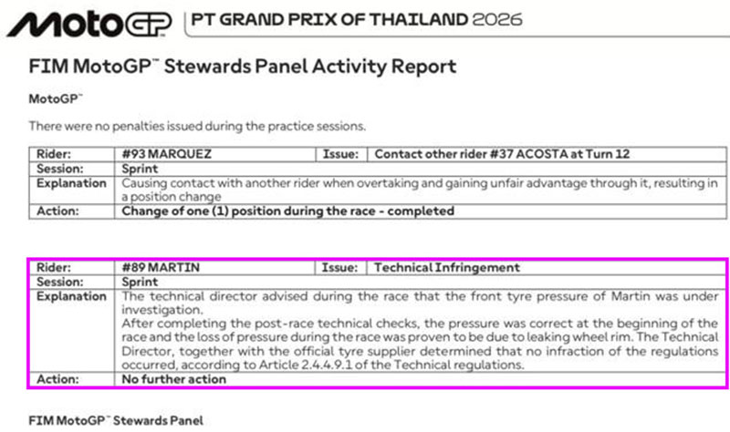Cependant, après un certain temps, Jorge Martin et Aprilia ont été blanchis de toute accusation, après que les Commissaires FIM MotoGP ont déterminé que la perte de pression était due à une fuite au niveau de la jante.