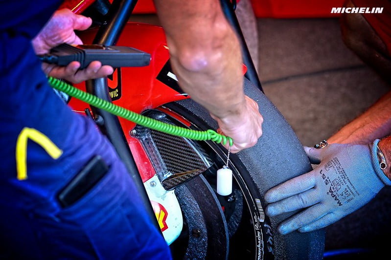 « En course, le pilote dispose d’alertes de pression au tableau de bord : aux quatre coins du tableau de bord, il y a quatre voyants de couleur qui indique une pression trop haute ou une pression trop basse dans le pneu avant et arrière, afin de l’avertir avant chaque virage si la pression est correcte. À l’arrière, le pilote sentira une pression incorrecte plus facilement, car ce sera à l’accélération, mais à l’avant, si la pression est trop haute, il se retrouvera par terre en entrée de virage sans avoir eu le temps de comprendre. »