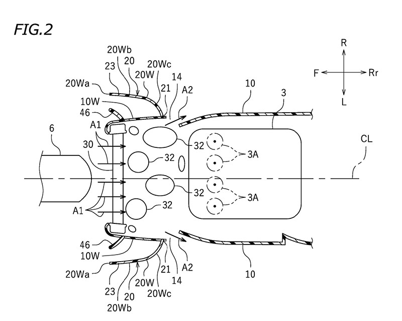 • et un élément de guidage (downwash duct) disposé à l’extérieur du carénage latéral dans la direction de la largeur du véhicule et en avant de l’orifice de décharge d’air.