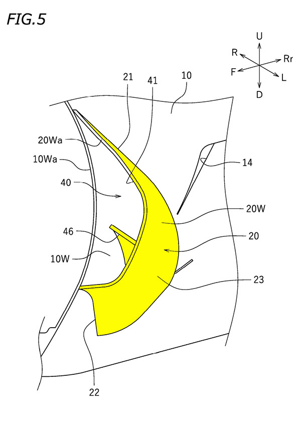En outre, puisque l’élément de guidage est disposé à l’extérieur du carénage latéral, le volume de l’échangeur thermique n’est pas limité par l’installation de cet élément. Il devient donc possible d’augmenter le volume de l’échangeur thermique.