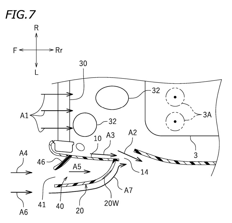 Nous nous étions donc résignés à ne pas comprendre pourquoi de l’air pris horizontalement et rejeté vers le bas, réduisant à priori drastiquement la finesse aérodynamique, apportait un avantage… jusquà ce que nous trouvions, après de longues recherches, le brevet que Yamaha a déposé pour potntiellement exploiter ce principe sur les motos de série. Pour rappel, un tel brevet ne couvre pas la compétition, mais il est quand même étonnant que ce ne soit pas Ducati qui ait déposé un tel brevet…